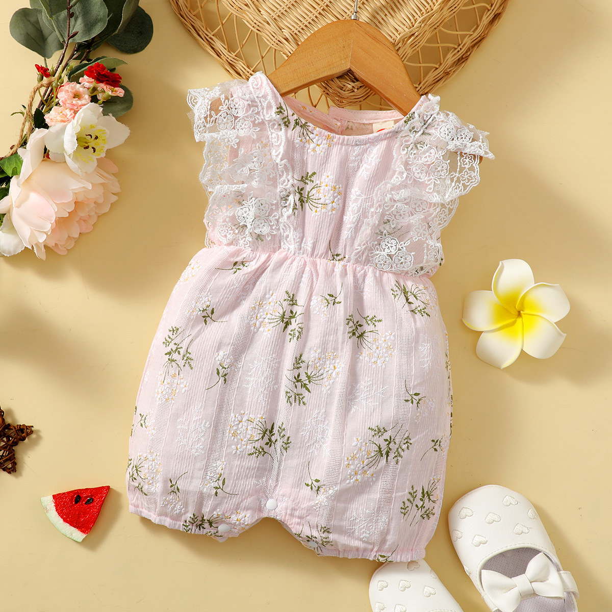 Baby Girl Floral Pattern Lace Decor Romper Wholesale