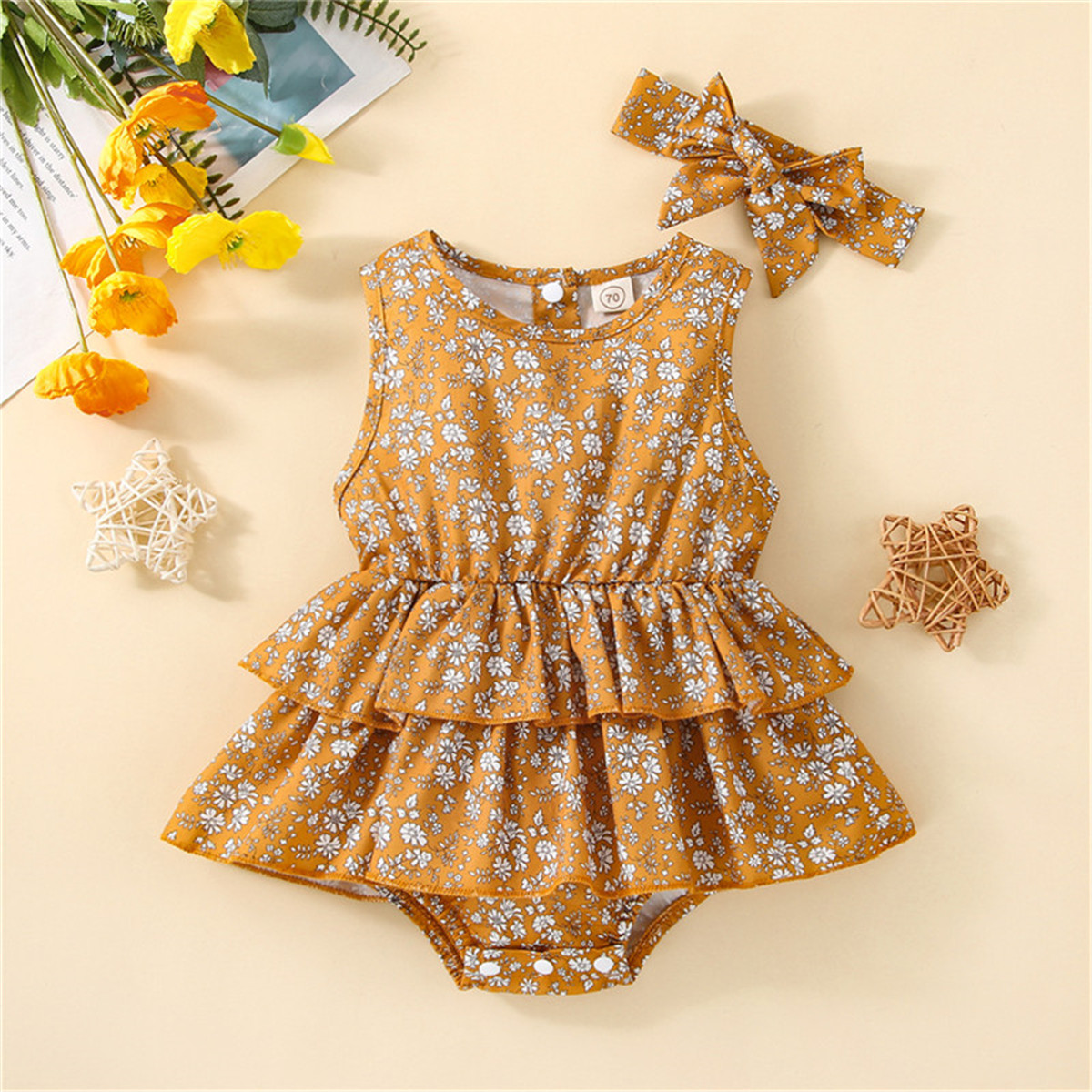 Baby Girl Floral Pattern Ruffle Decor Bodysuit & Headband Wholesale