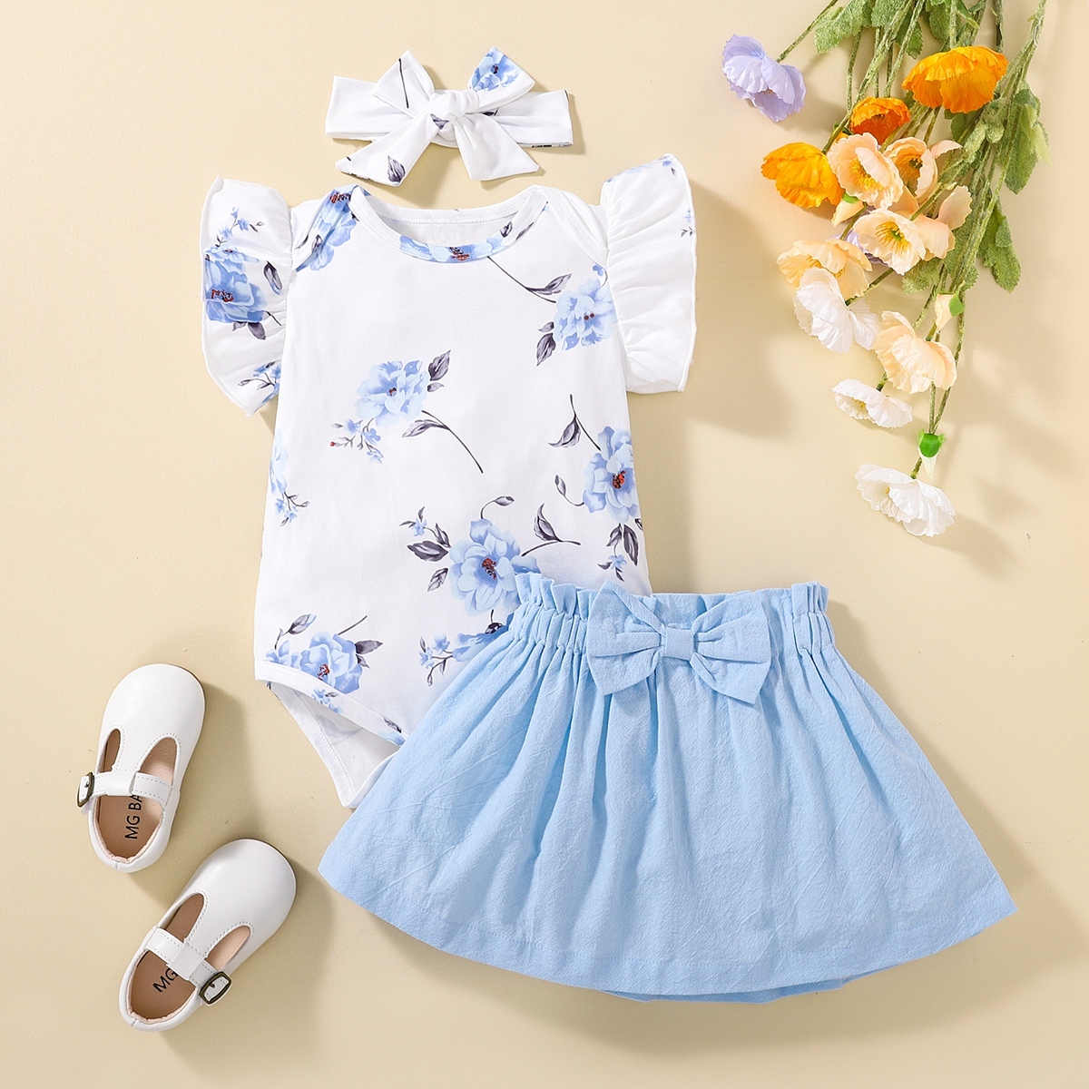 Baby Girl Floral Ruffle-sleeve Bodysuit And Bowknot Solid Colour Skirt With Headband Wholesale
