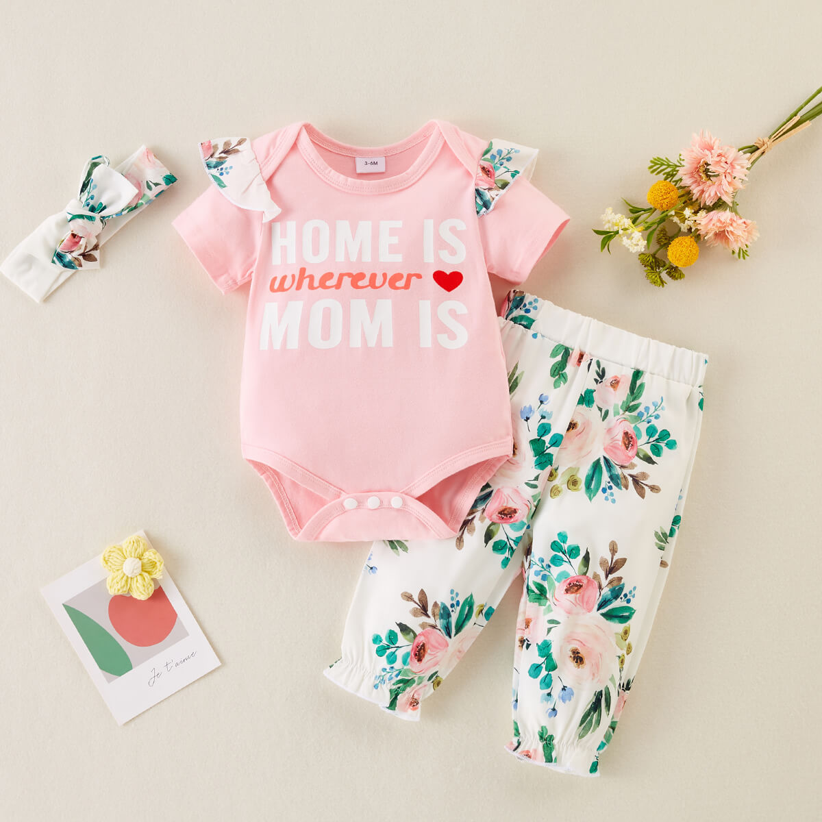 Baby Girl Letter Pattern Ruffle-sleeve Bodysuit & Floral Pants & Headband Wholesale