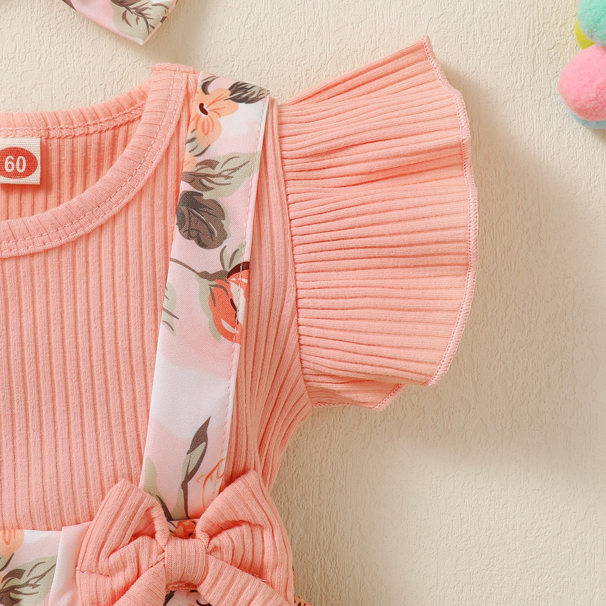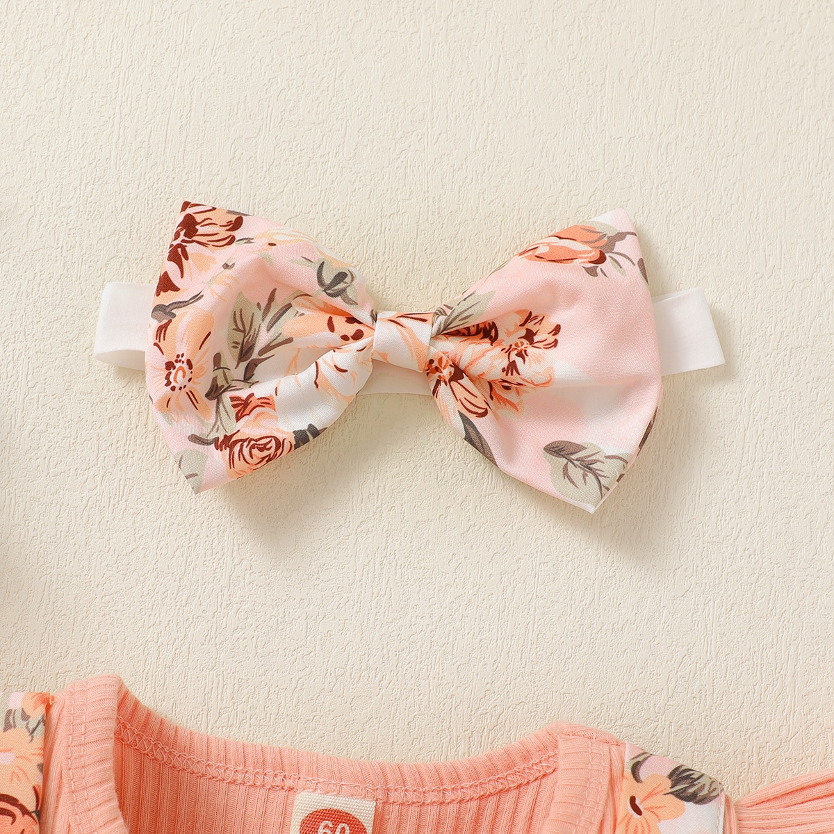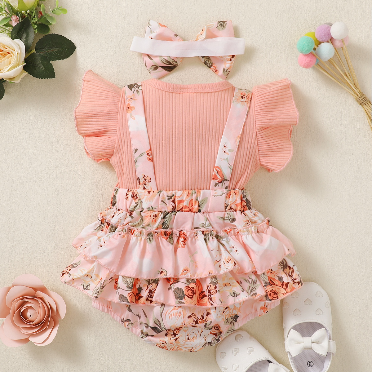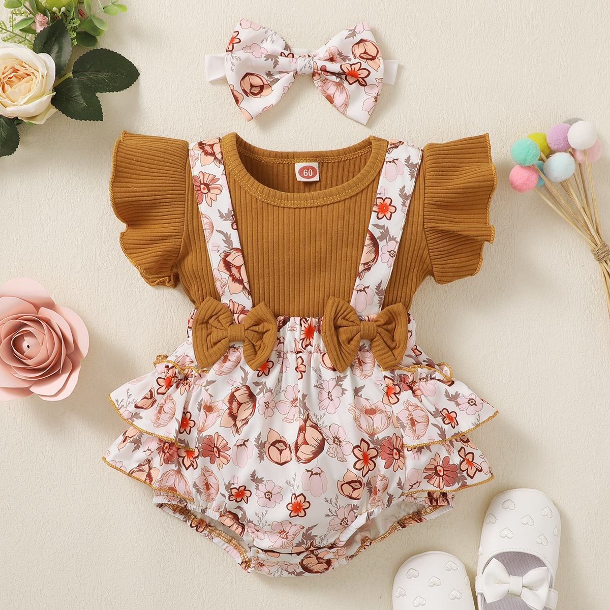 Baby Girl Ruffle-sleeve Patchwork Floral Bowknot Bodysuit with Headband Wholesale