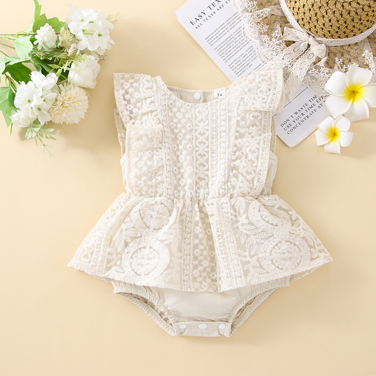 Baby Girl Solid Color Lace Floral Pattern Ruffle-sleeve Bodysuit Wholesale