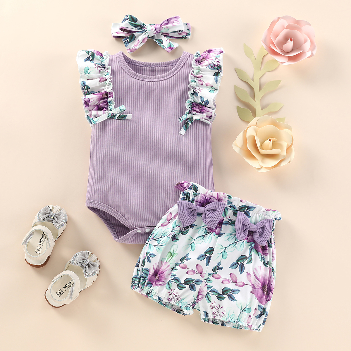Baby Girl Solid Colour Ruffle-sleeve Bodysuit And Floral Shorts with Headband Wholesale