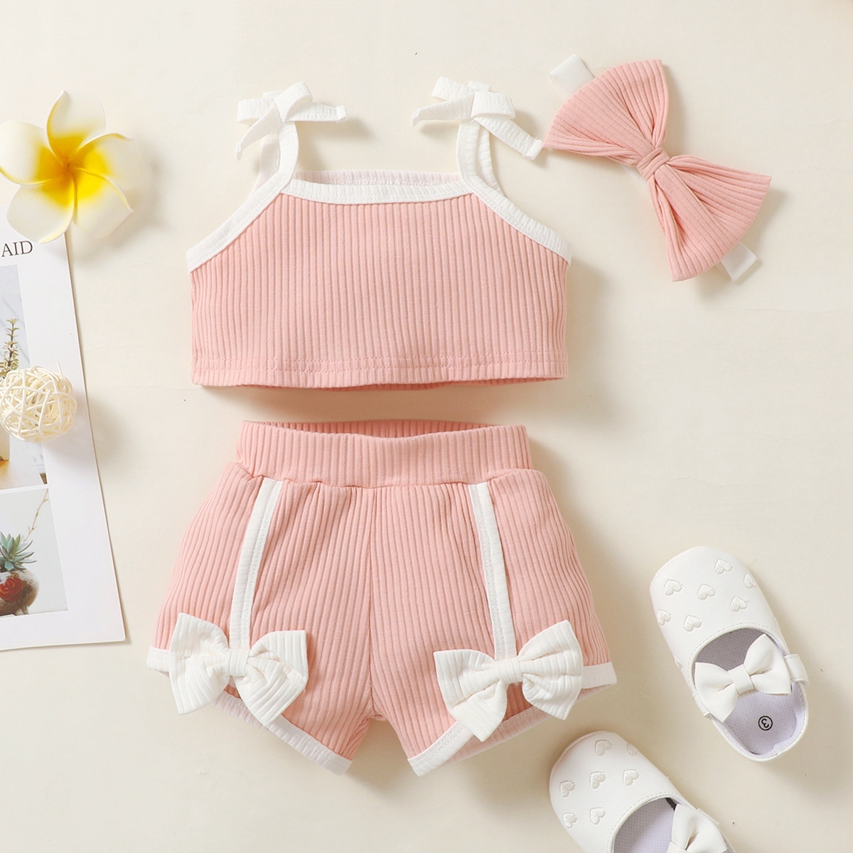 Baby Girl Solid Colour Sling Top And Bowknot Shorts with Headband Wholesale