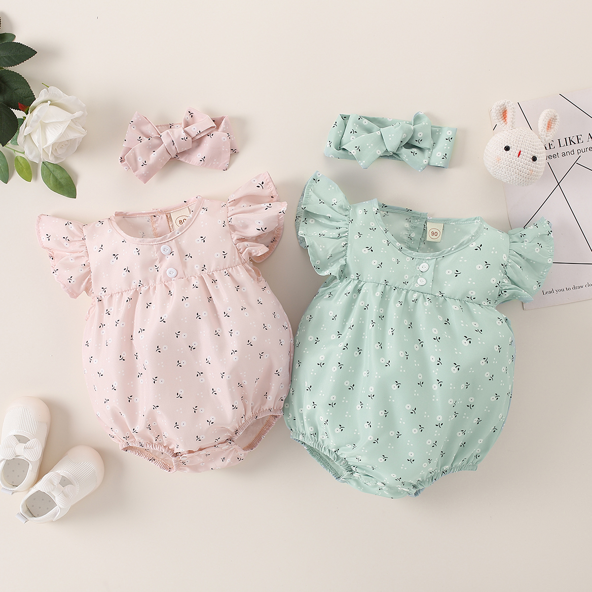 Baby Girl Sweet Floral Pattern Ruffle-sleeve Bodysuit & Headband Wholesale