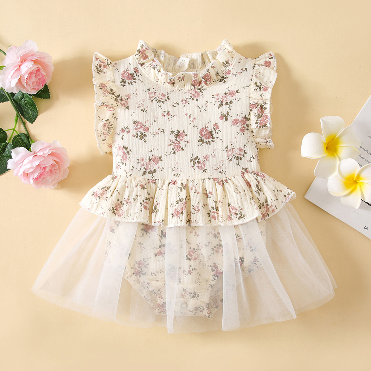 Baby Girl Sweet Floral Ruffle Sleeve Bodysuit With Tulle Skirt Wholesale
