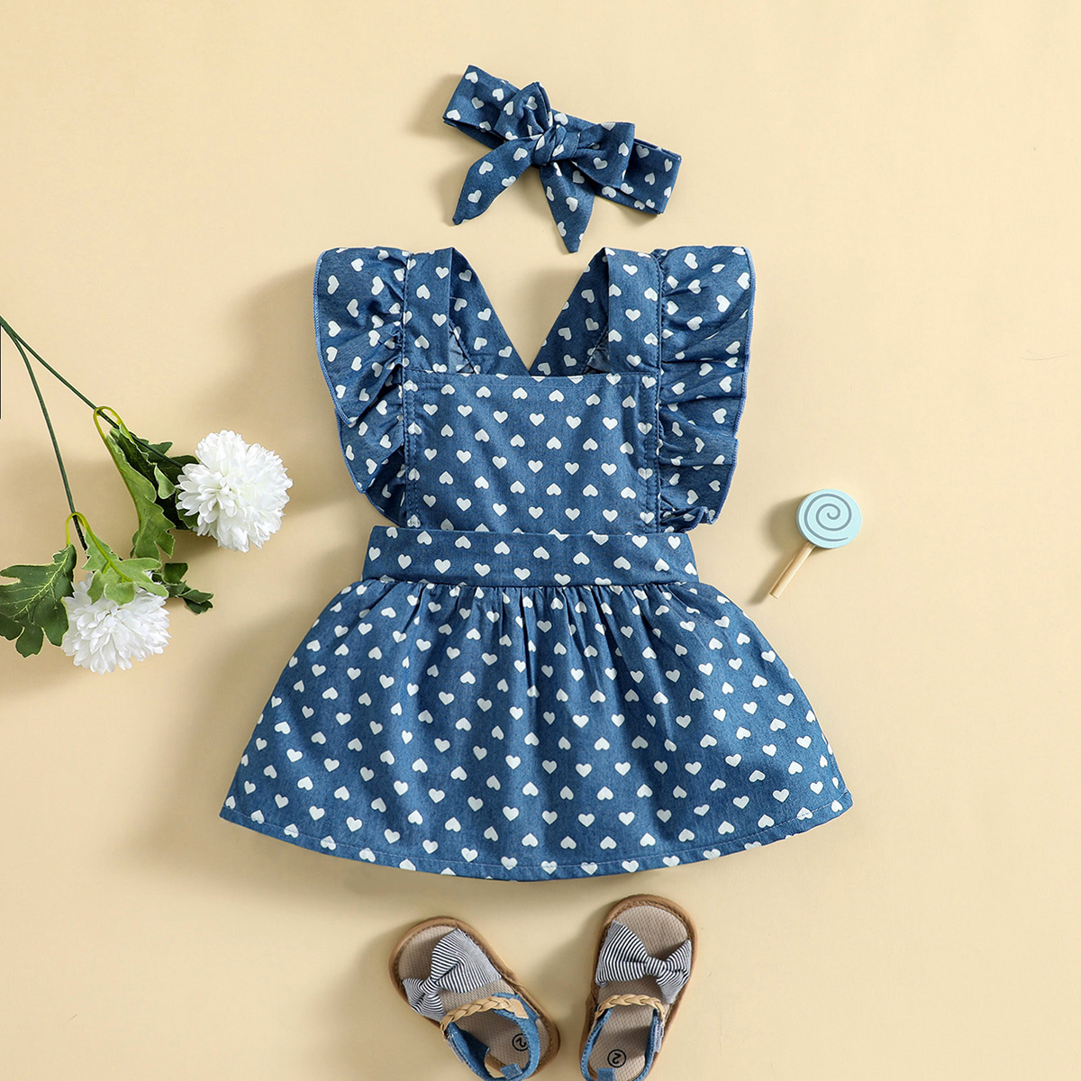 Baby Girl Sweet Heart-shaped Print Ruffle-sleeve Dress with Headband Wholesale