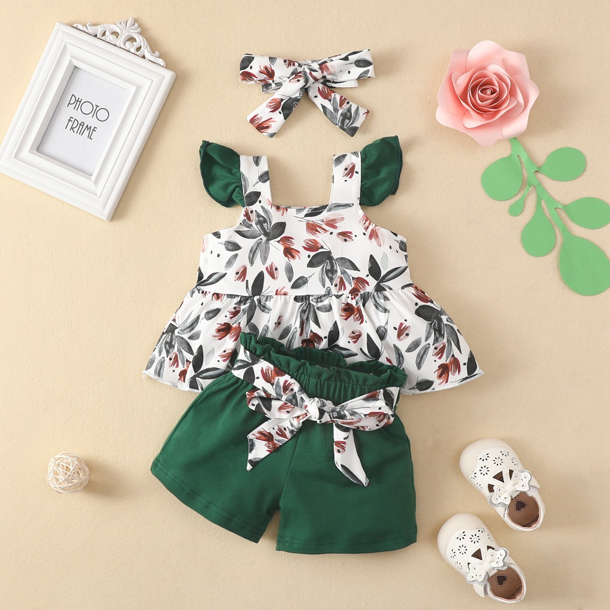 Baby Girl Sweet Ruffle-sleeve Floral Top And Solid Shorts with Headband Wholesale