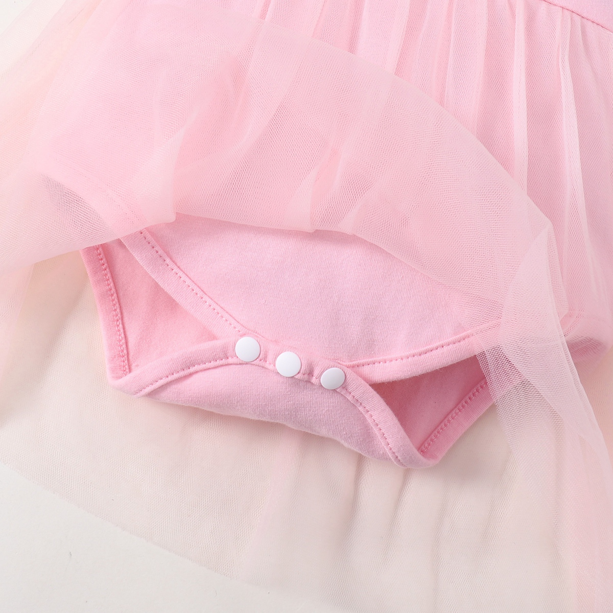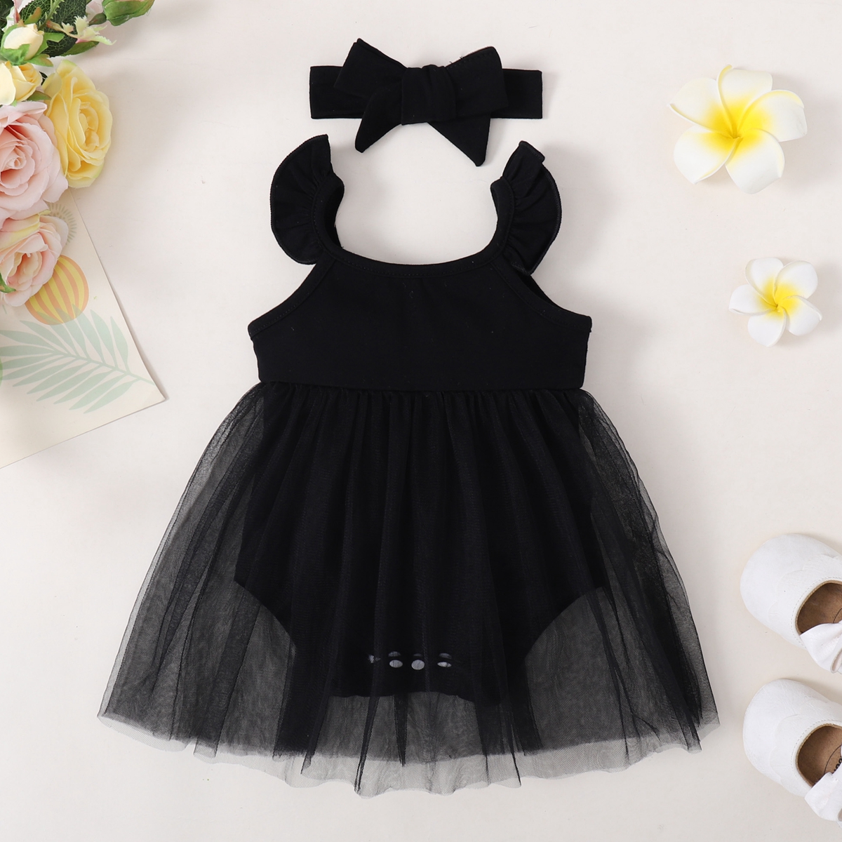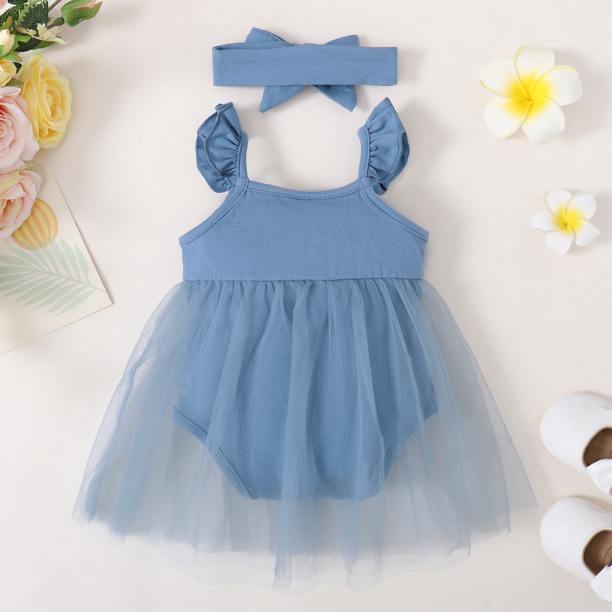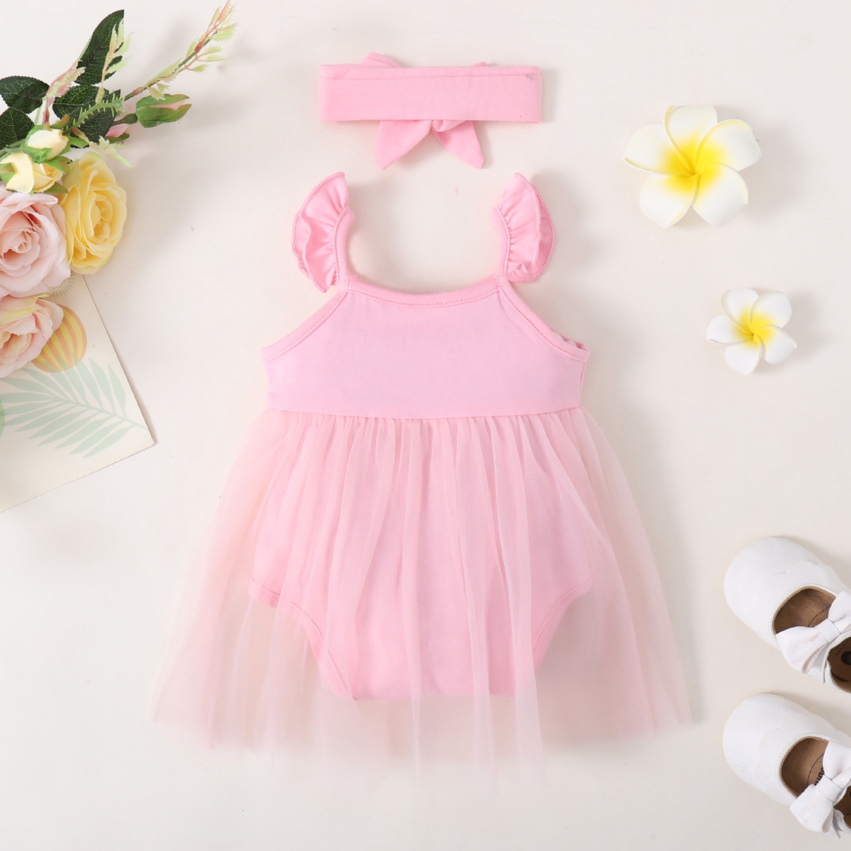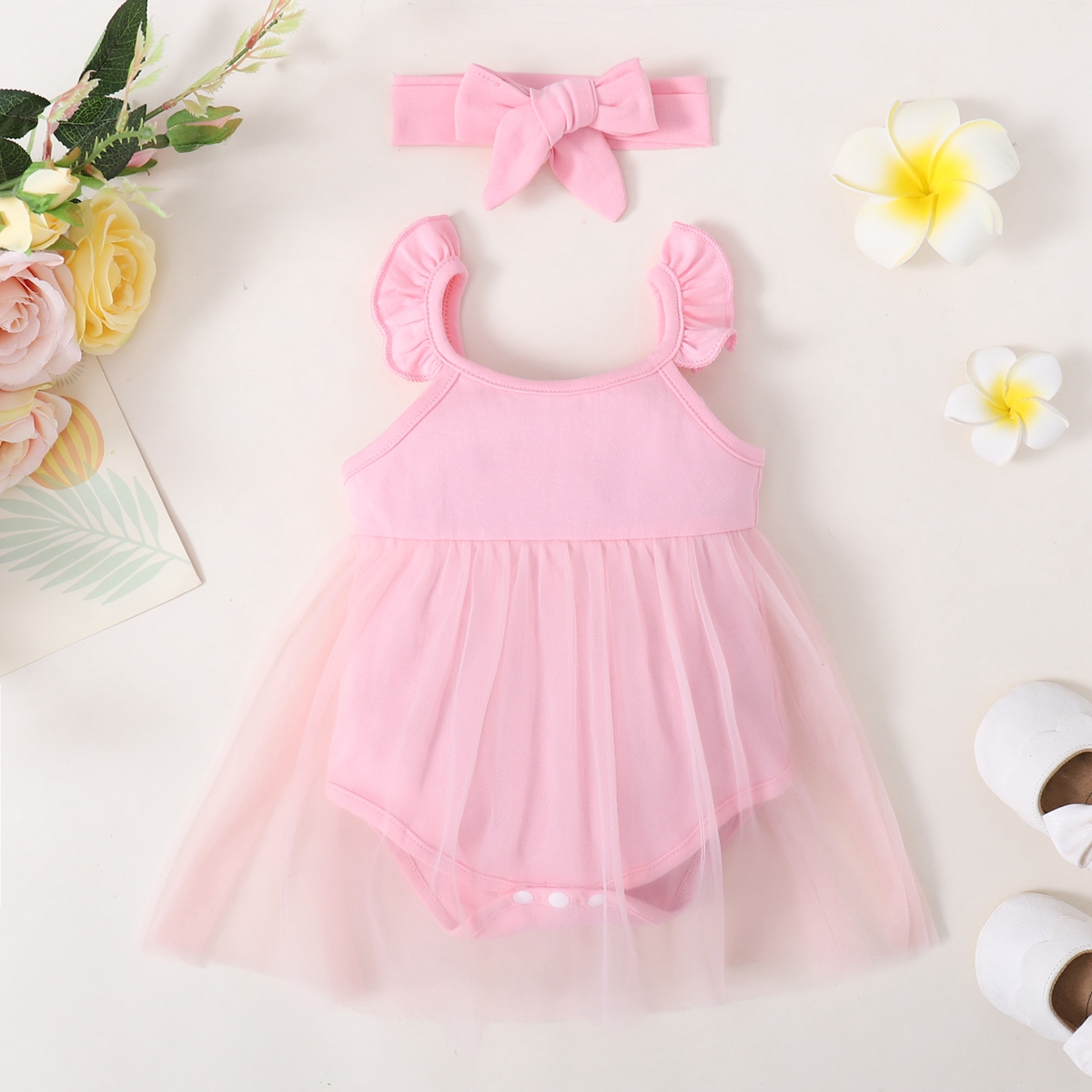 Baby Girl Sweet Sling Solid Colour Mesh Bodysuit with Headband Wholesale