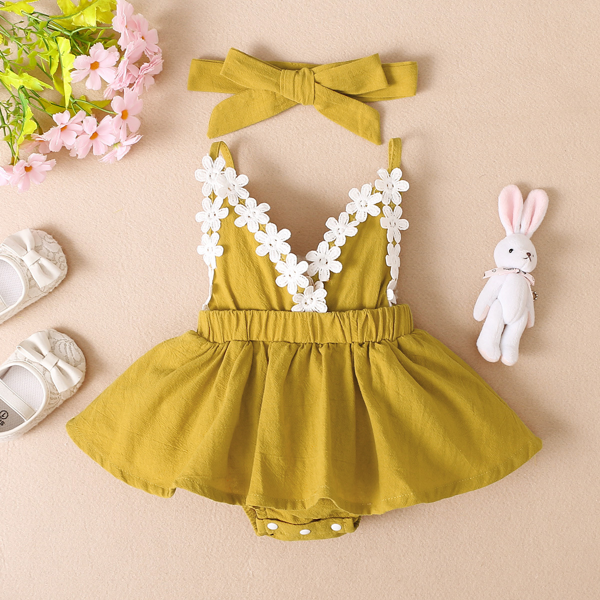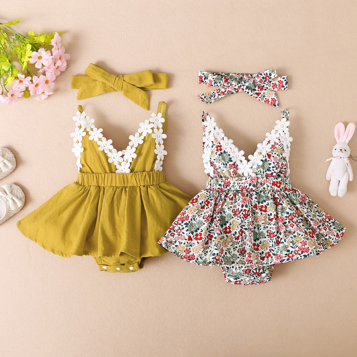 hibobi Girl Baby V-neck Floral Halter Dress Bodysuit & Headband Wholesale
