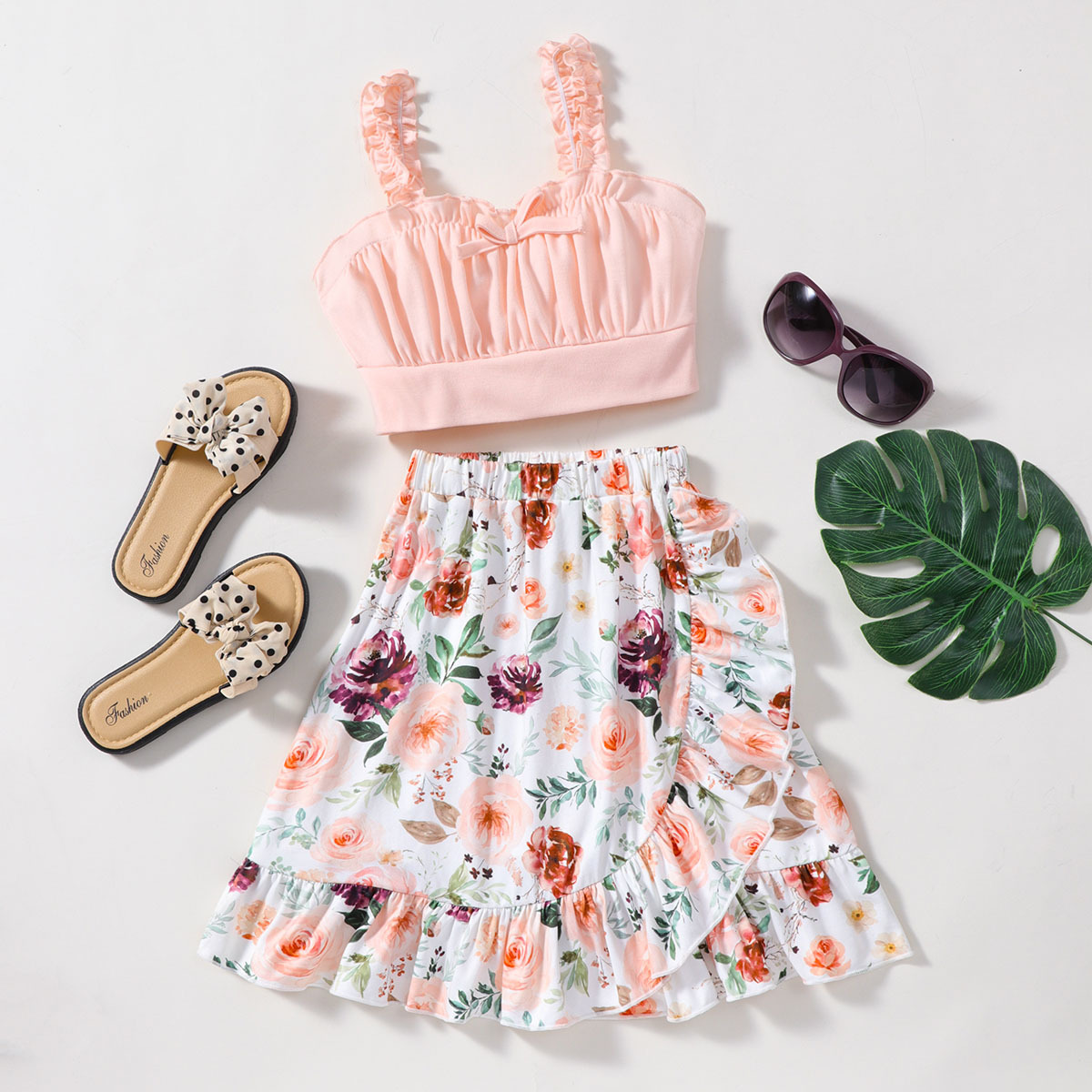 Kid Girl Solid Color Suspenders Top & Floral full print A-line skirt Suit Wholesale
