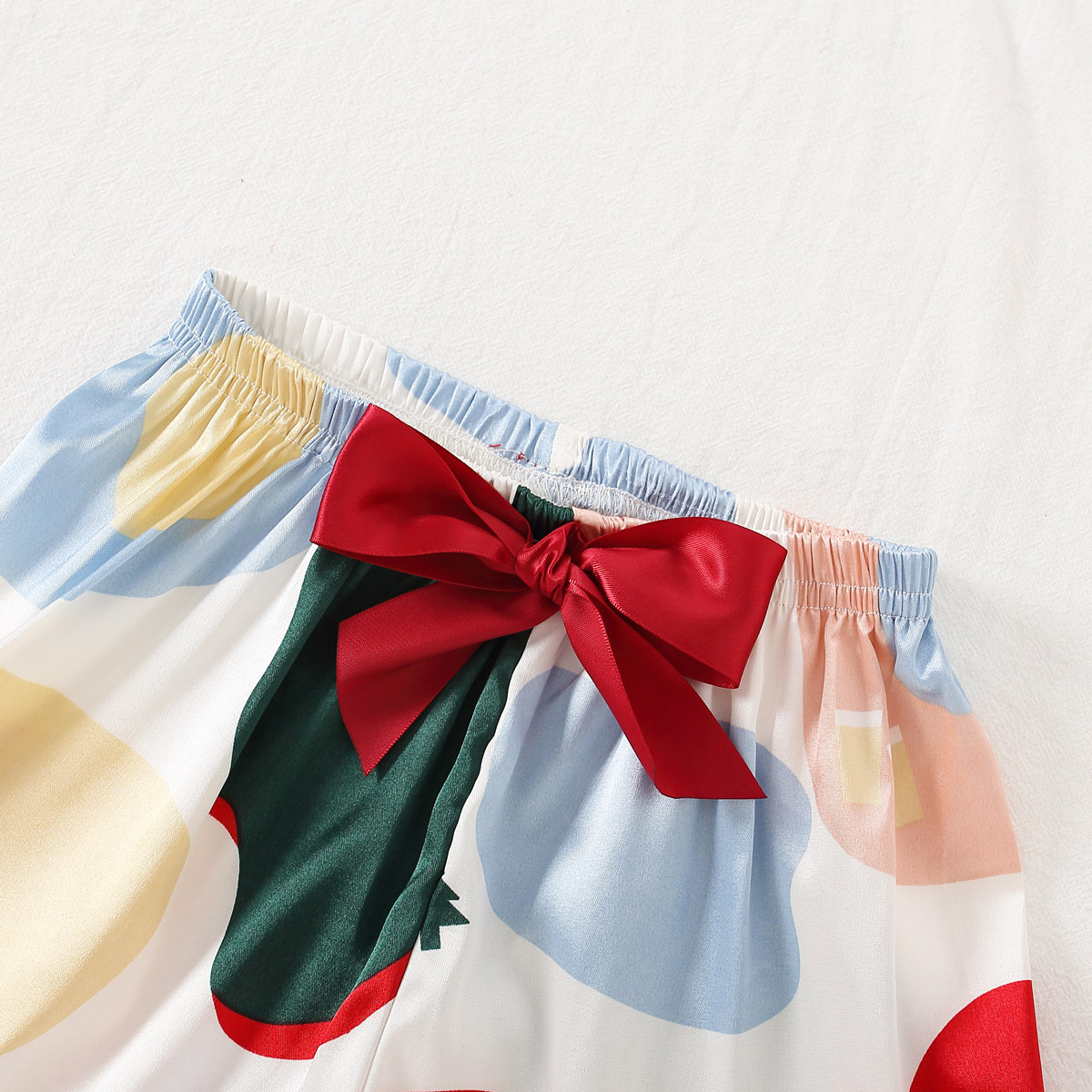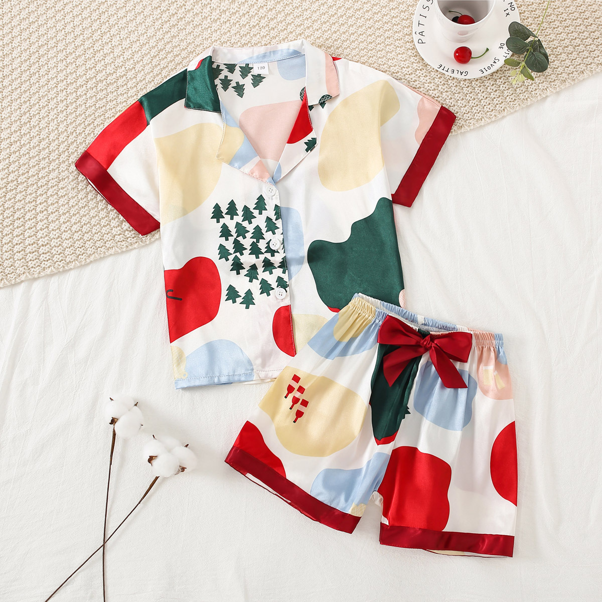 Kids Girls Summer Thin Tracksuit Scenery Bowknot Tree Short Sleeve Suit Wholesale