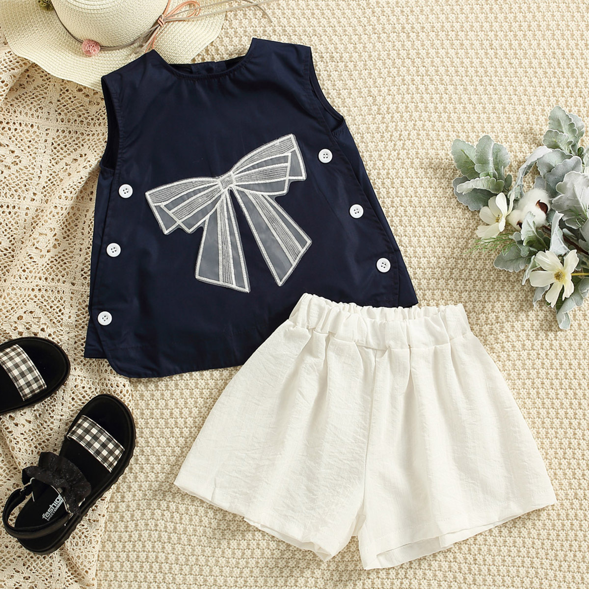 Kids Girls Summer Vacation Daily Solid Bowknot T-shirt & Shorts Wholesale