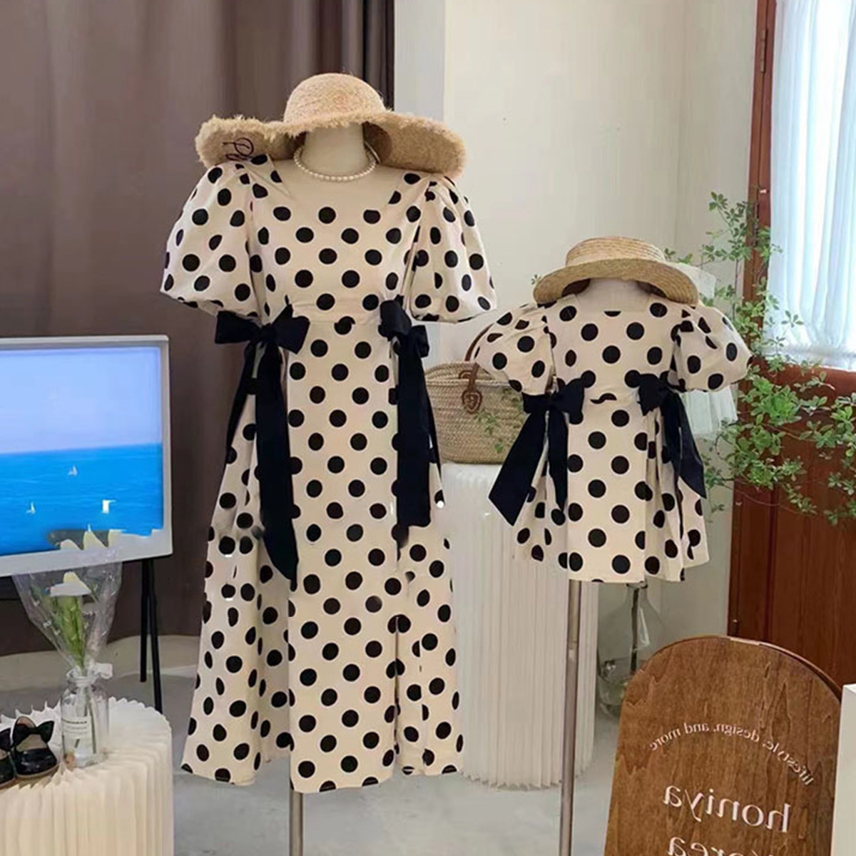 Sweet Wave Point Print Puff Sleeve Dress for Mom and Me Wholesale