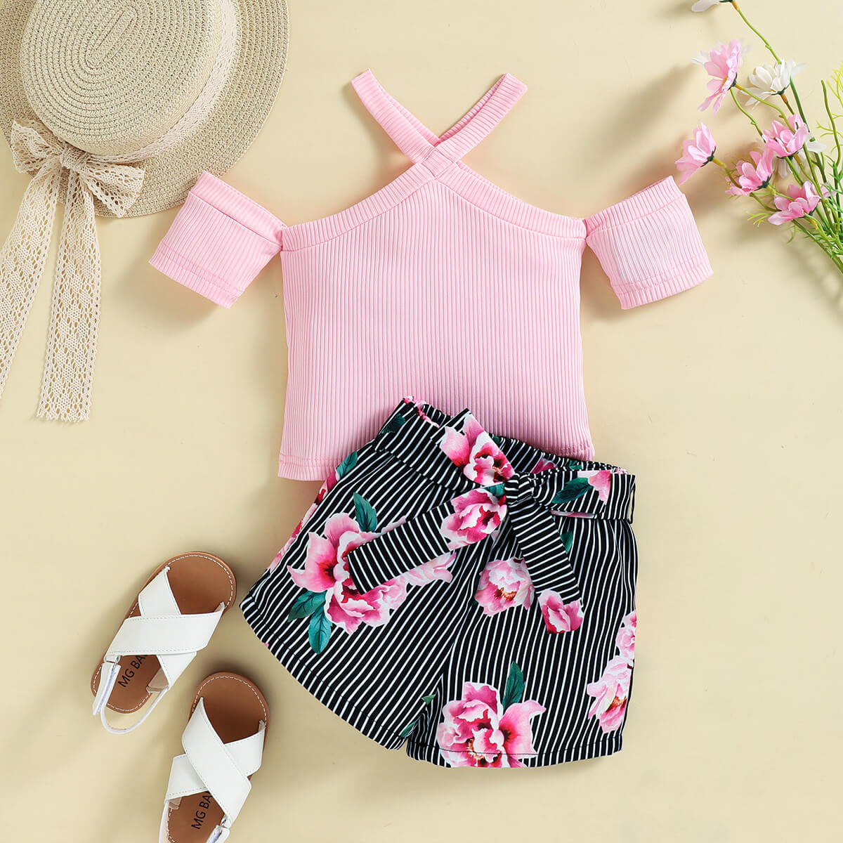 Toddler Girl Fashion Floral T-shirt & Shorts & Belt Wholesale