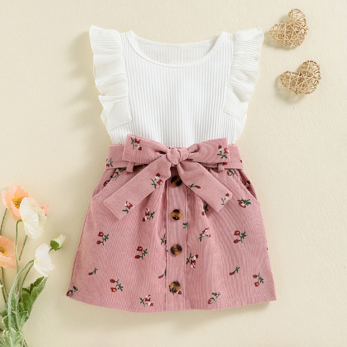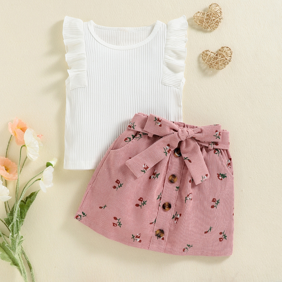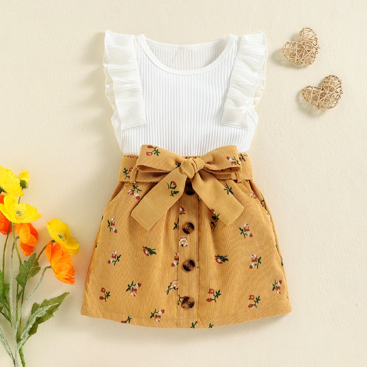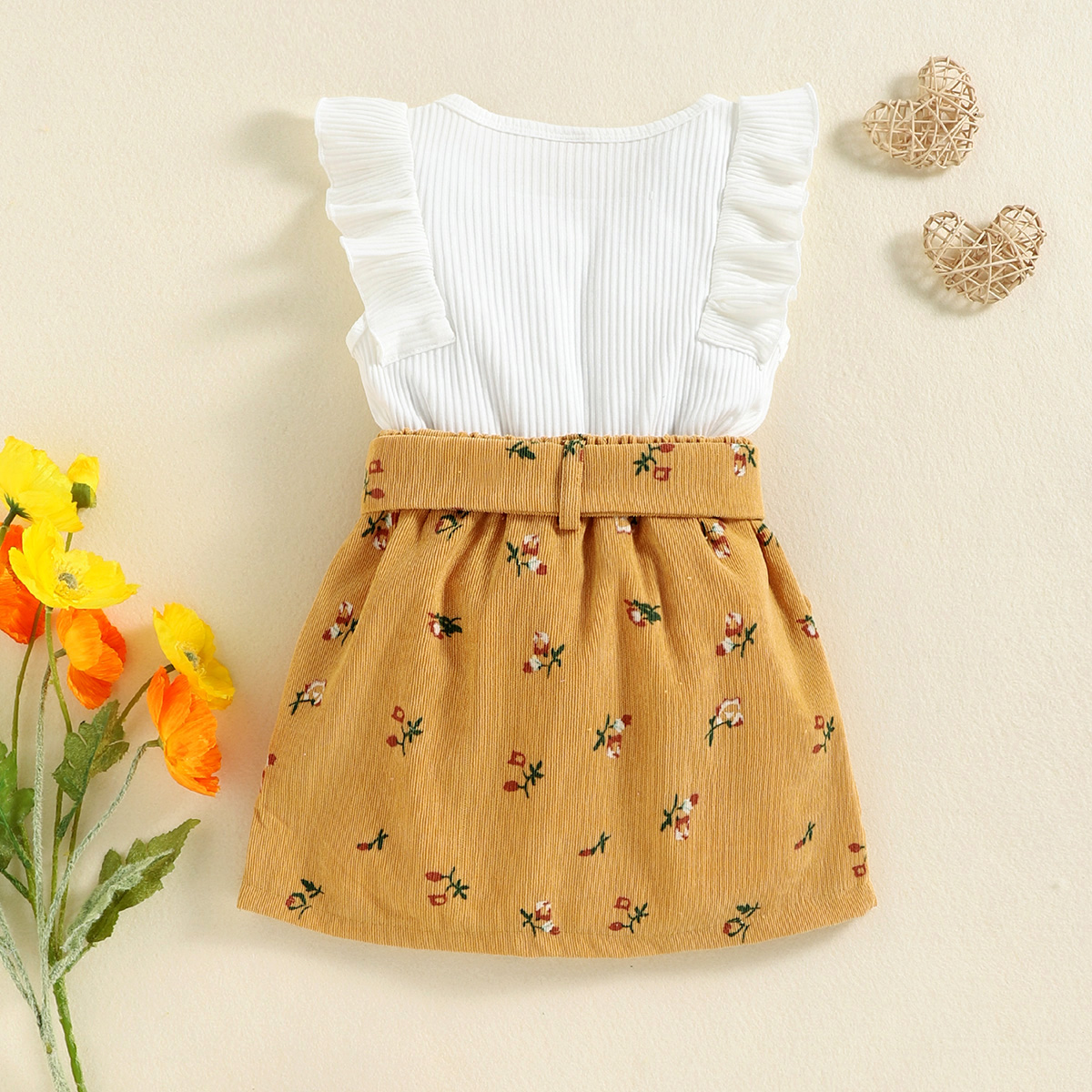 Toddler Girl Solid Ribbed Tropical Top & Corduroy A-line skirt Wholesale