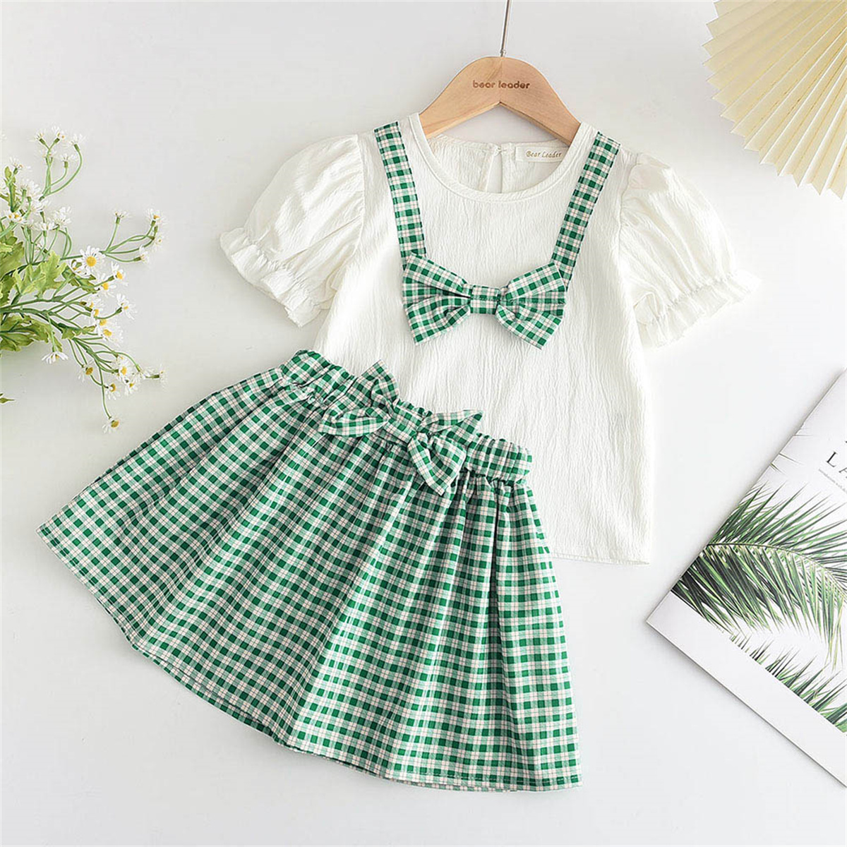 Toddler Girl Sweet Plaid Bow Knot Decor T-shirt & Skirt Wholesale