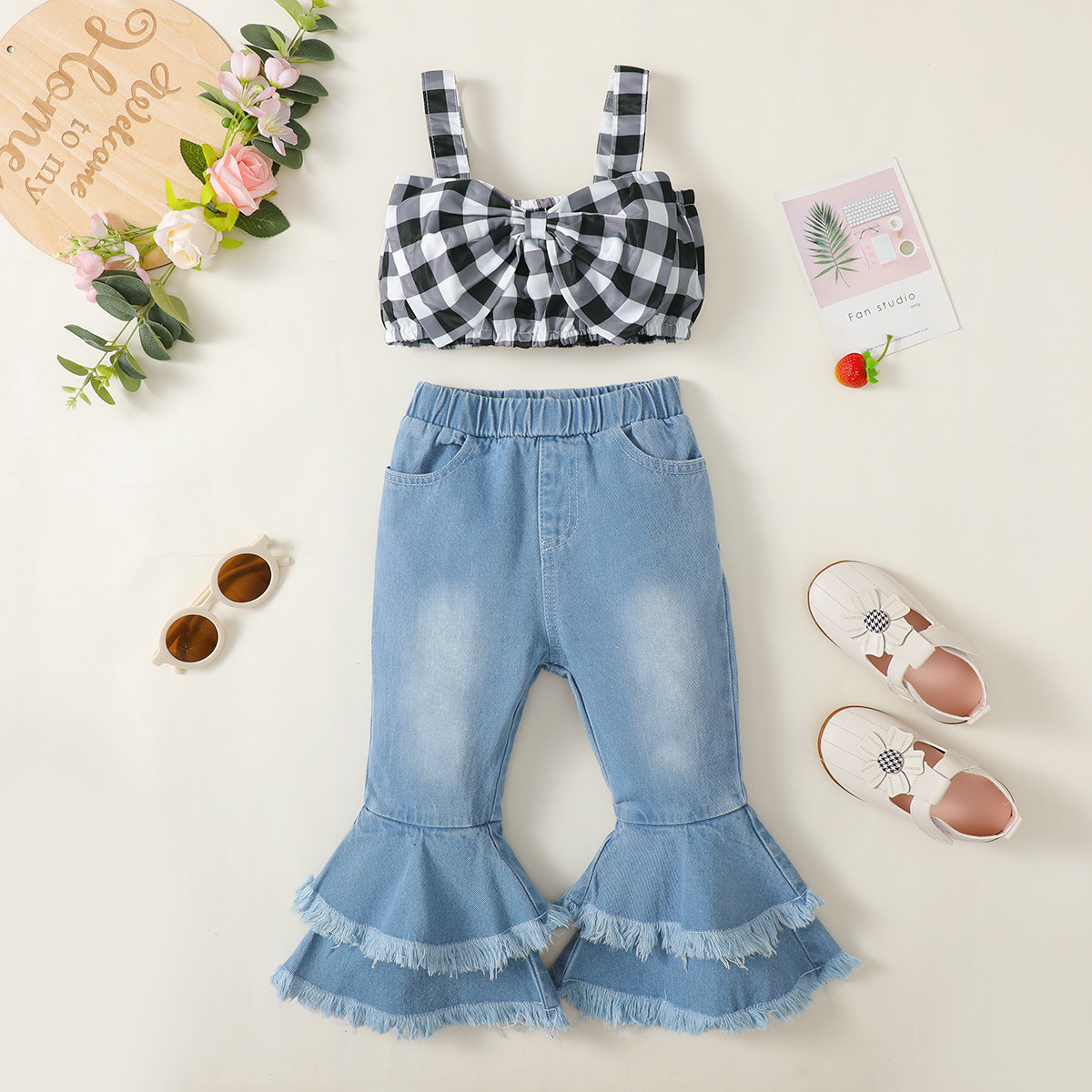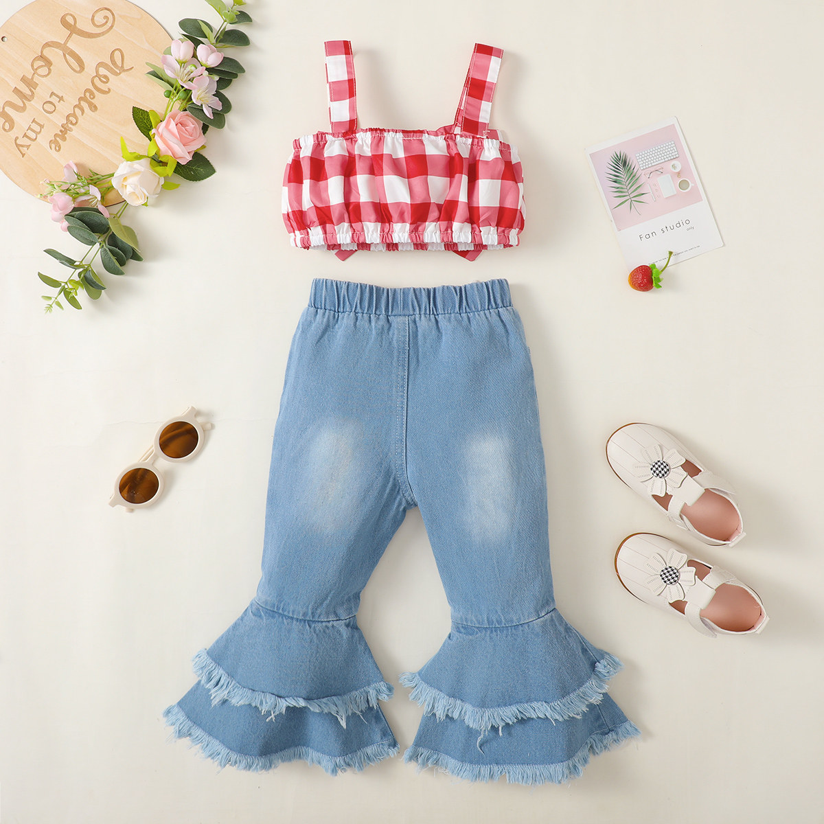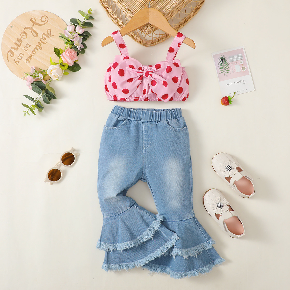 Toddler Girls Straps Plaid Polka Dot Top & Pants Wholesale