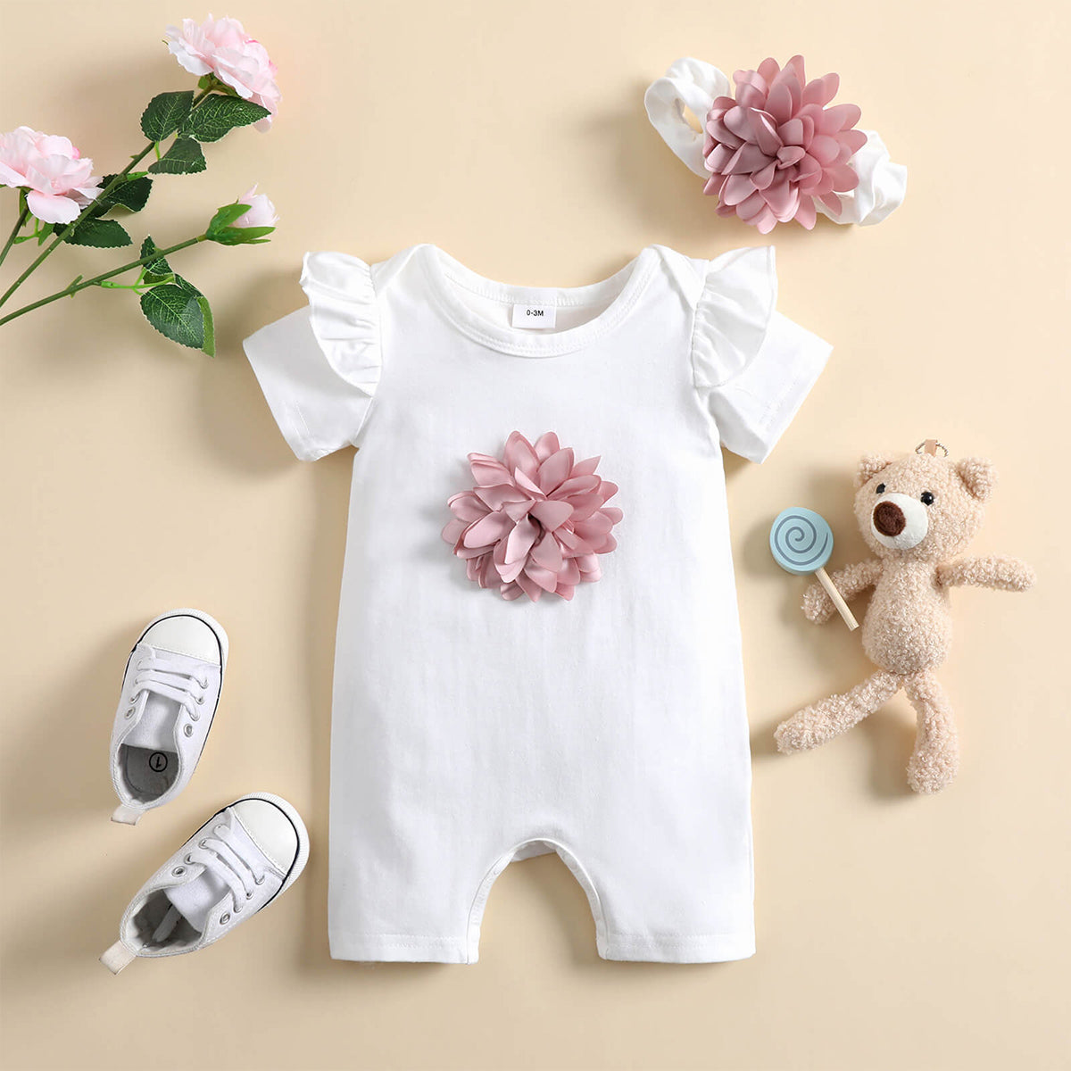Baby Girl 2 Pieces 3-D Floral Pattern Decor Solid Ruffle-sleeve Romper & Headband Wholesale