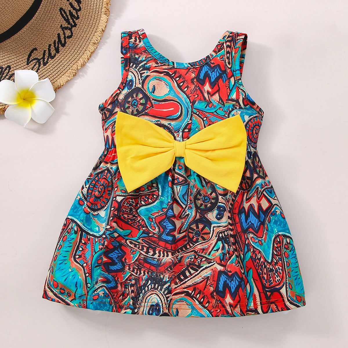 Baby Girl Folk-custom Floral Pattern Bow Decor Sleeveless Dress Wholesale