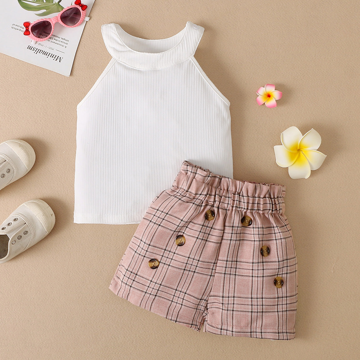 Toddler Girls Round Neck Plaid Solid Top & Shorts Wholesale