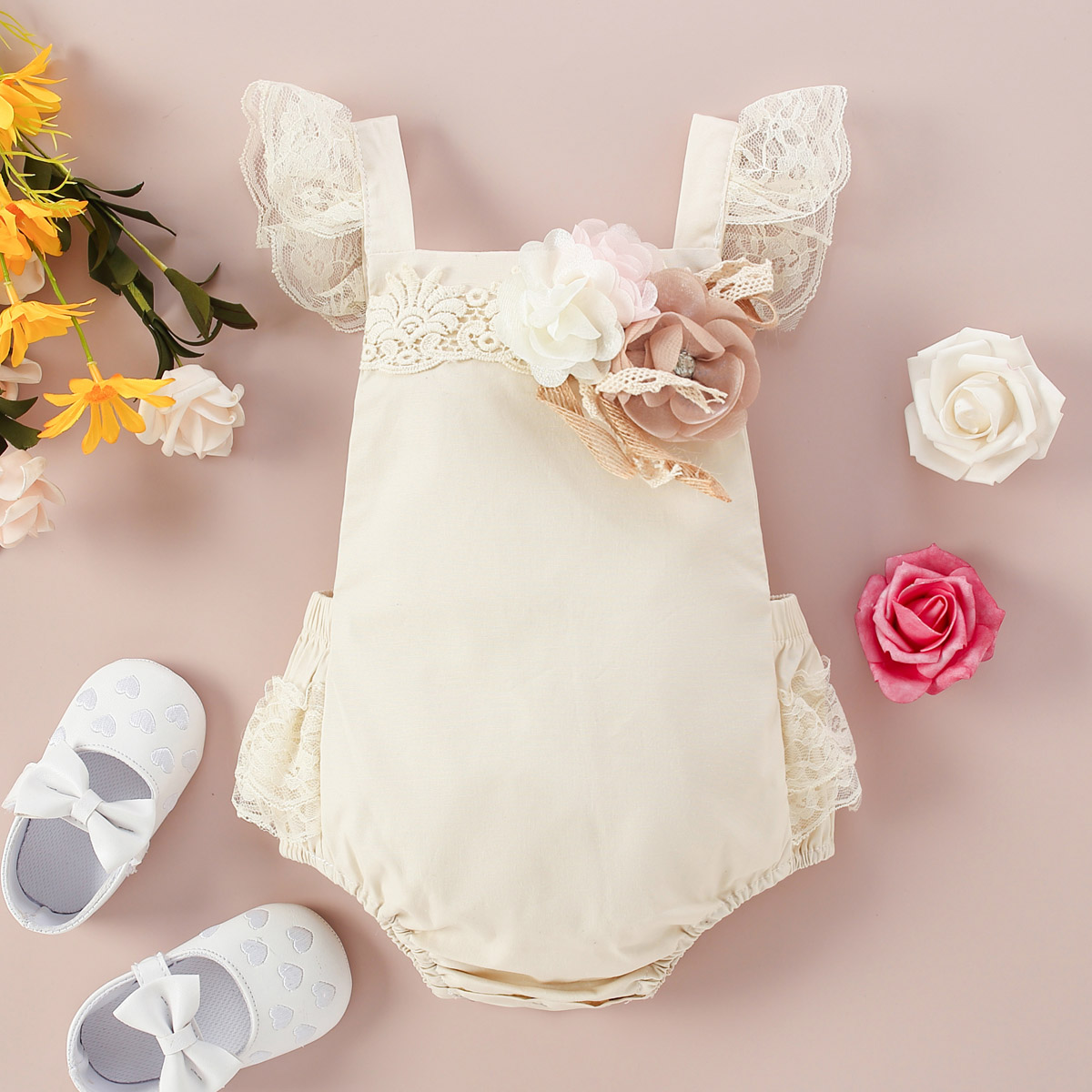 Baby Girl Embroidered Decorative Beads Floral Pattern Lace Decor Bodysuit Wholesale