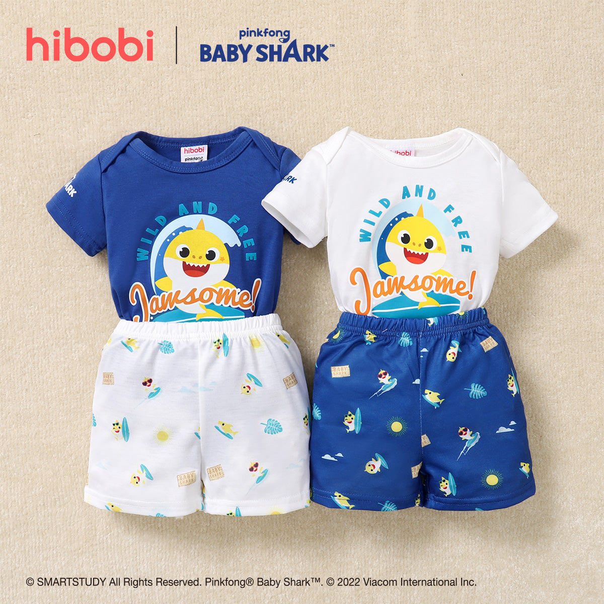 hibobi×BabyShark Baby Boy Cartoon Print Short Sleeve Cotton Two-piece Top+Pants Wholesale