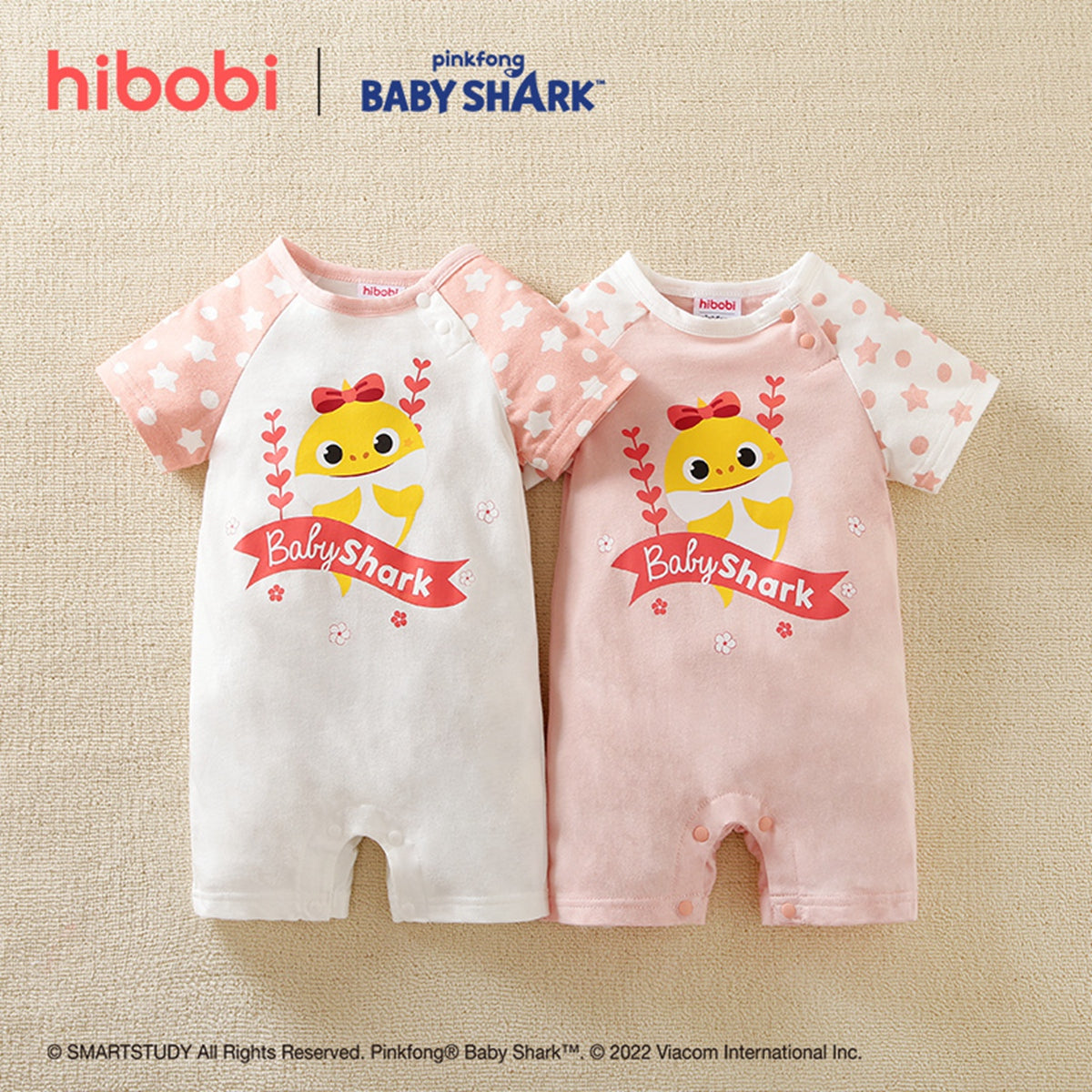 hibobi×Babyshark Baby Girl Cartoon Print Short Sleeve Cotton Jumpsuit Wholesale