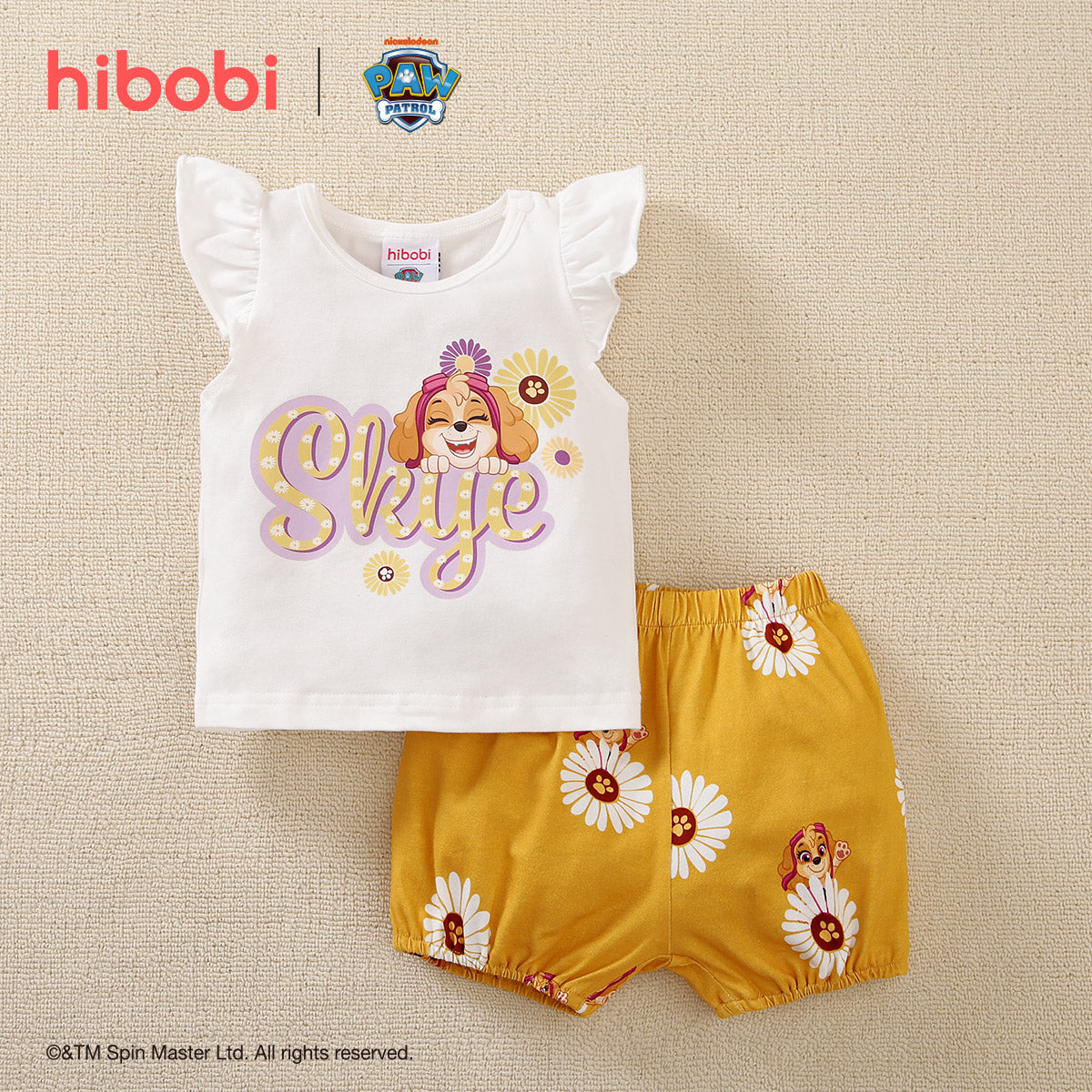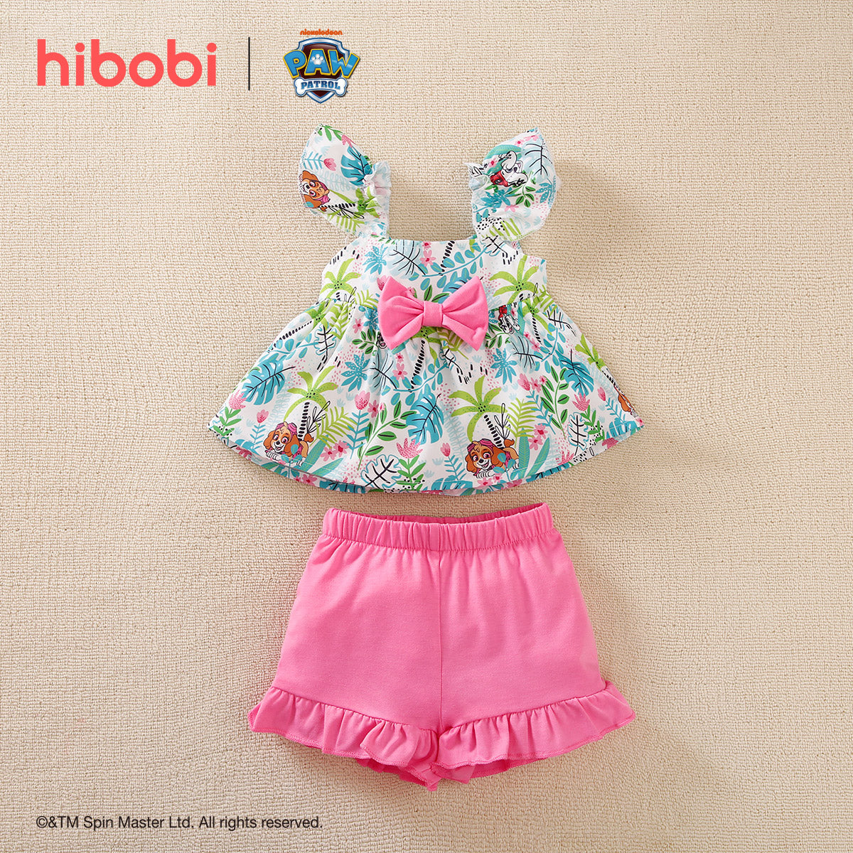 hibobi×PAW Patrol Baby Girl Cartoon Print Ruffle Short Sleeve T-shirt and Pants Set Wholesale