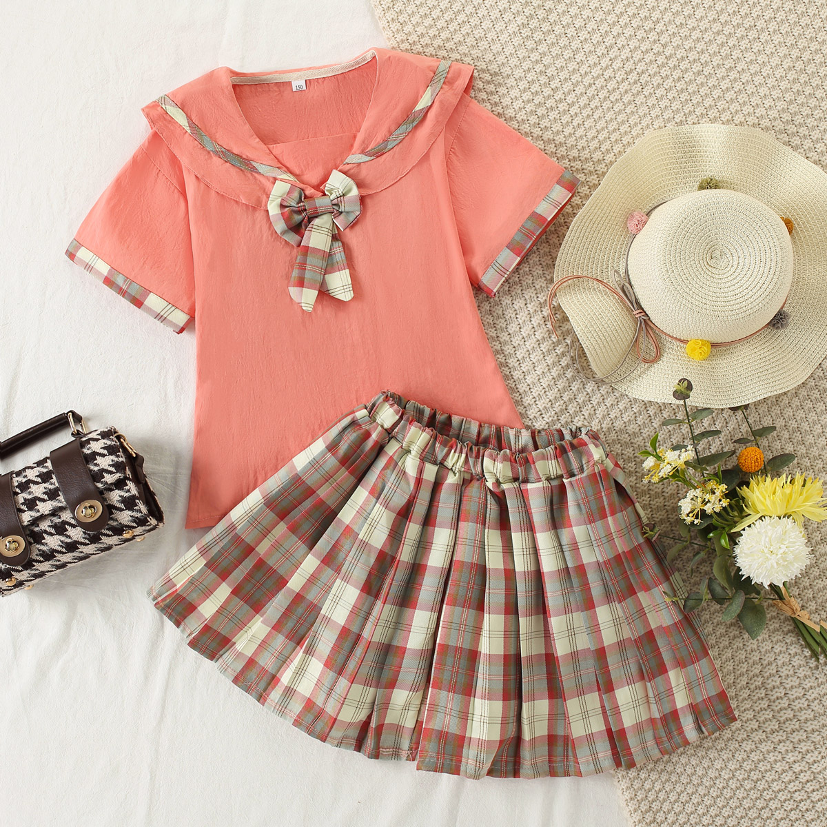 Girls Summer Dress Cute Plaid Bow Two Piece Suit Skirt Wholesale