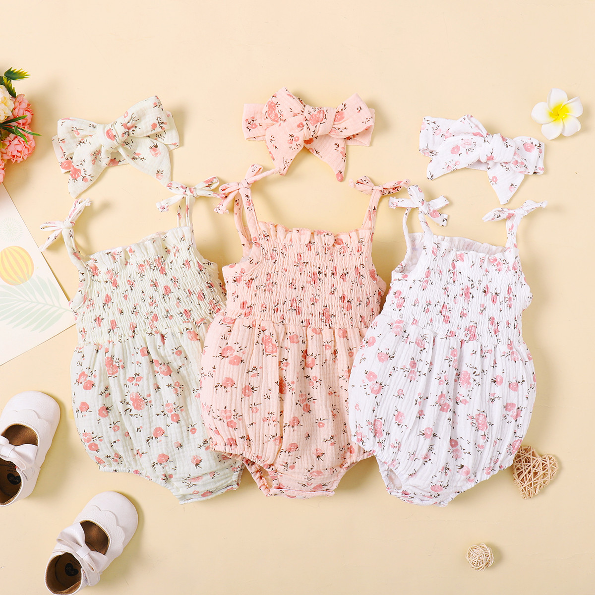 Baby Girl Sweet Floral Pattern Suspender Pleats Bodysuit & Headband Wholesale