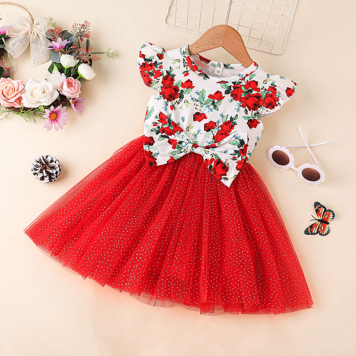 Toddler Girl Sweet Tulle Press Bow Knot Decor Ruffle Sleeve Dress Wholesale