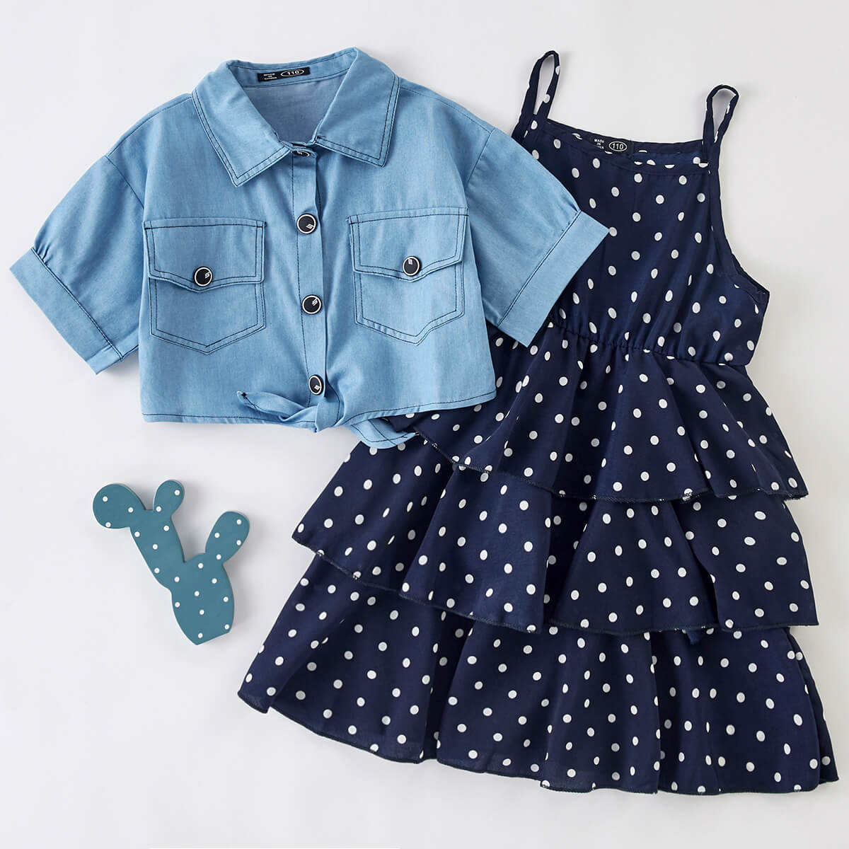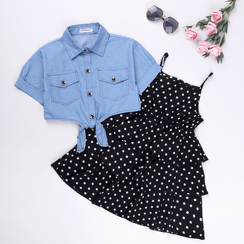 2-piece Denim Tops & Sling Polka Dot Layered Dress for Girl Wholesale