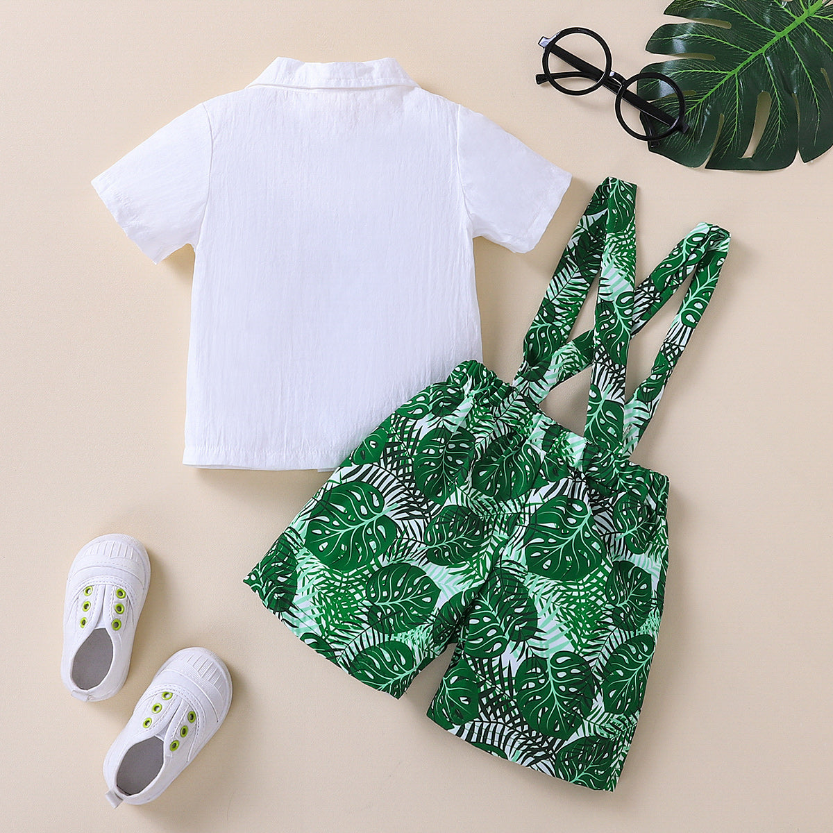 Baby Boy Two-piece Short-sleeved Shirt & Palm Leaf Print Bib Shorts Wholesale