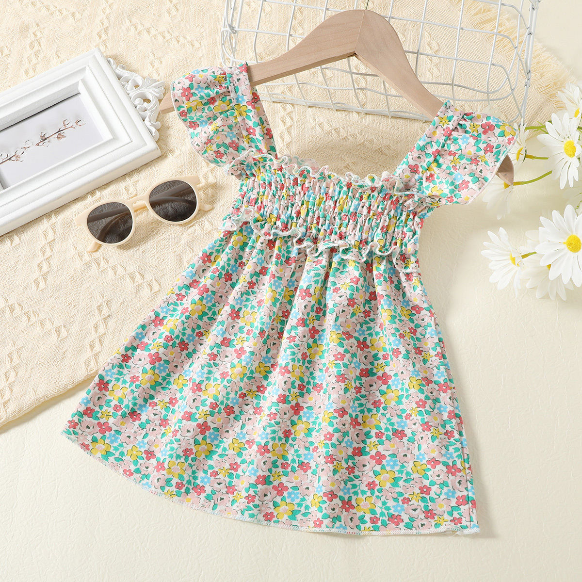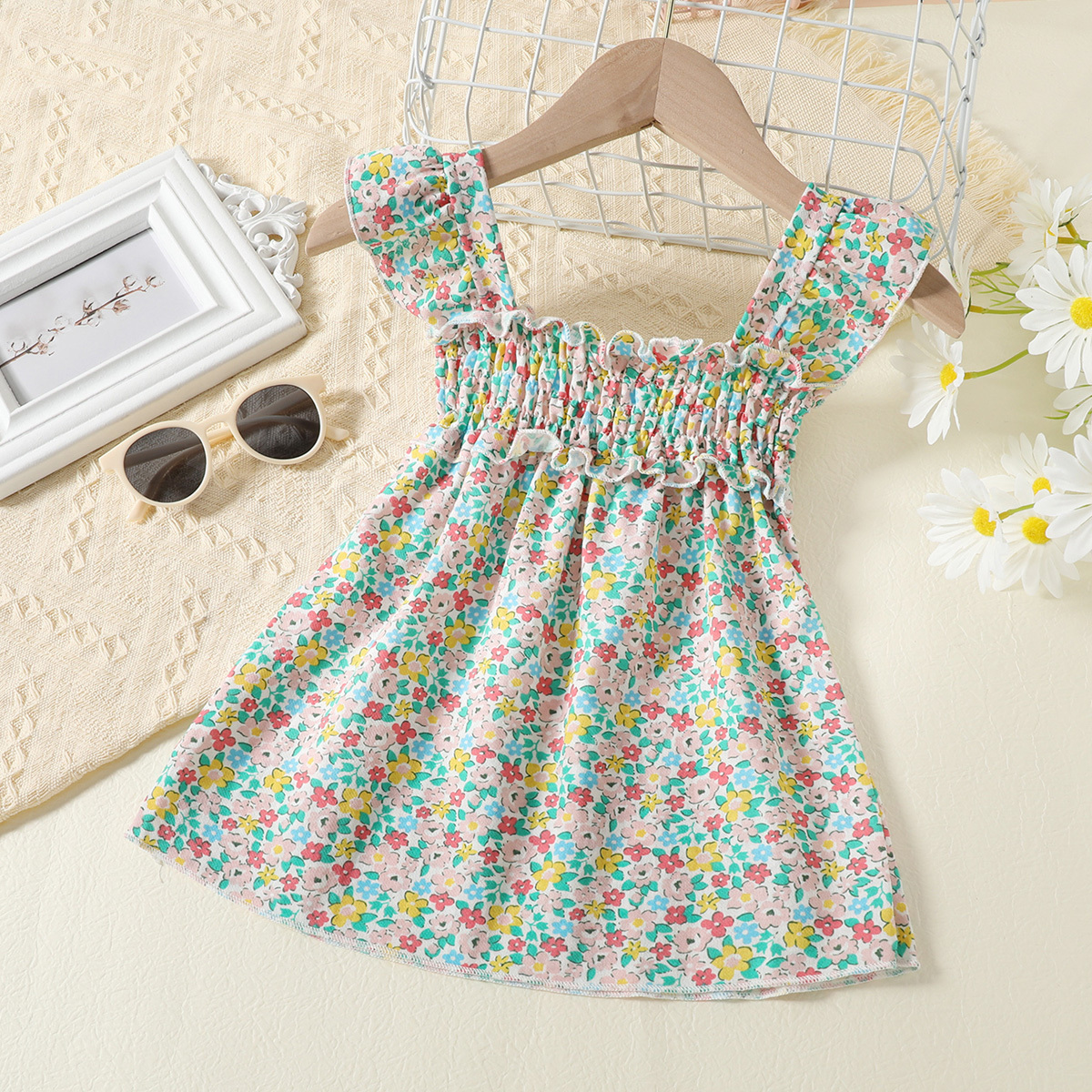 Baby Girl Floral Pattern Suspender Ruffle-sleeve Dress Wholesale