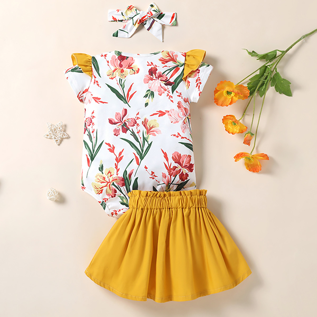 Baby Girl Ruffle Floral Bodysuit And Solid Skirt with Headband Wholesale