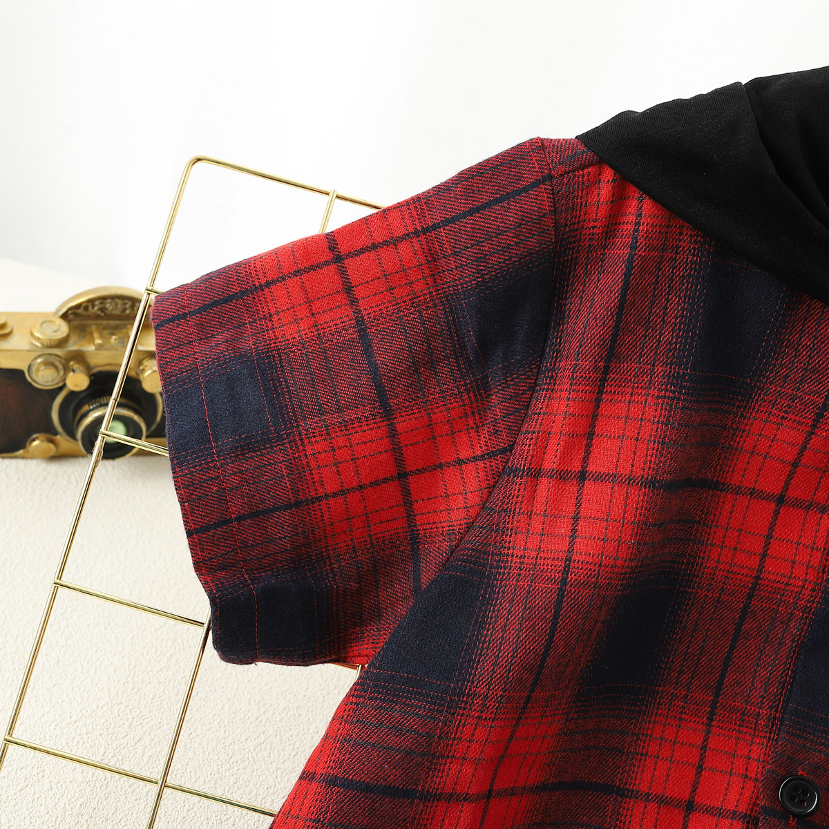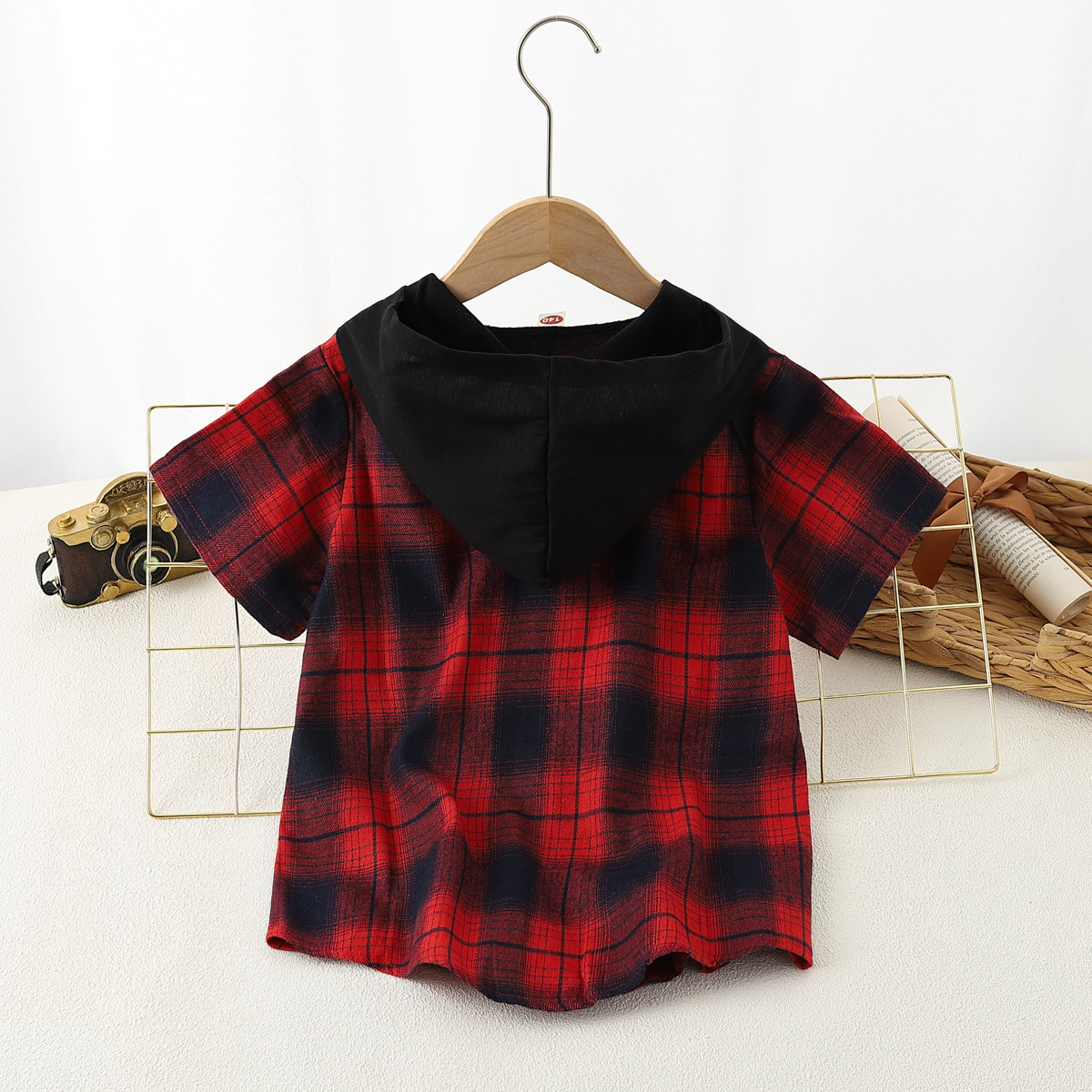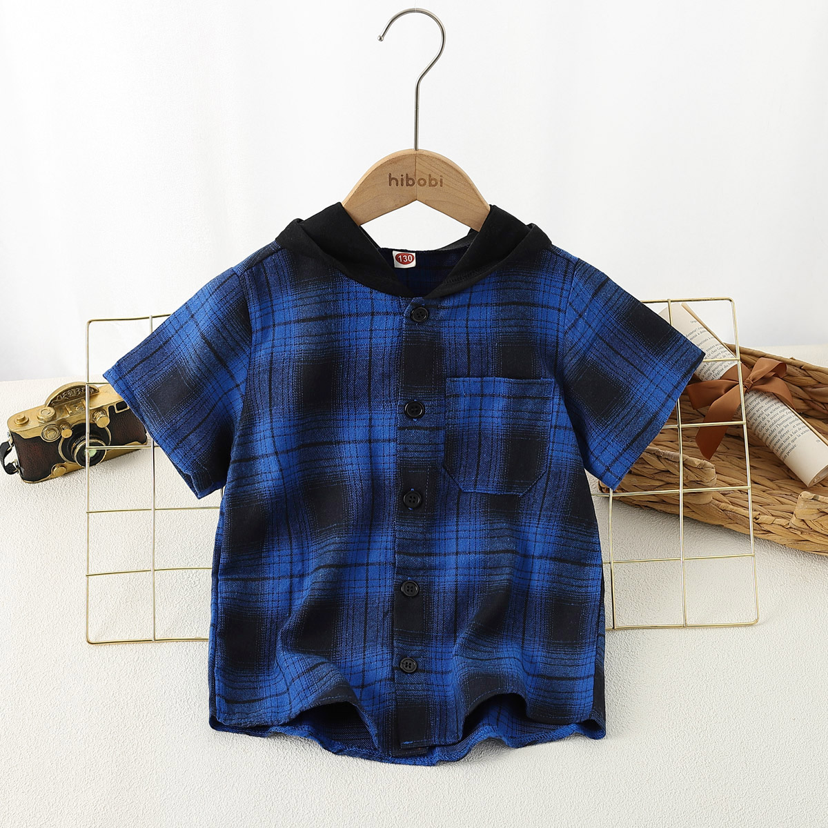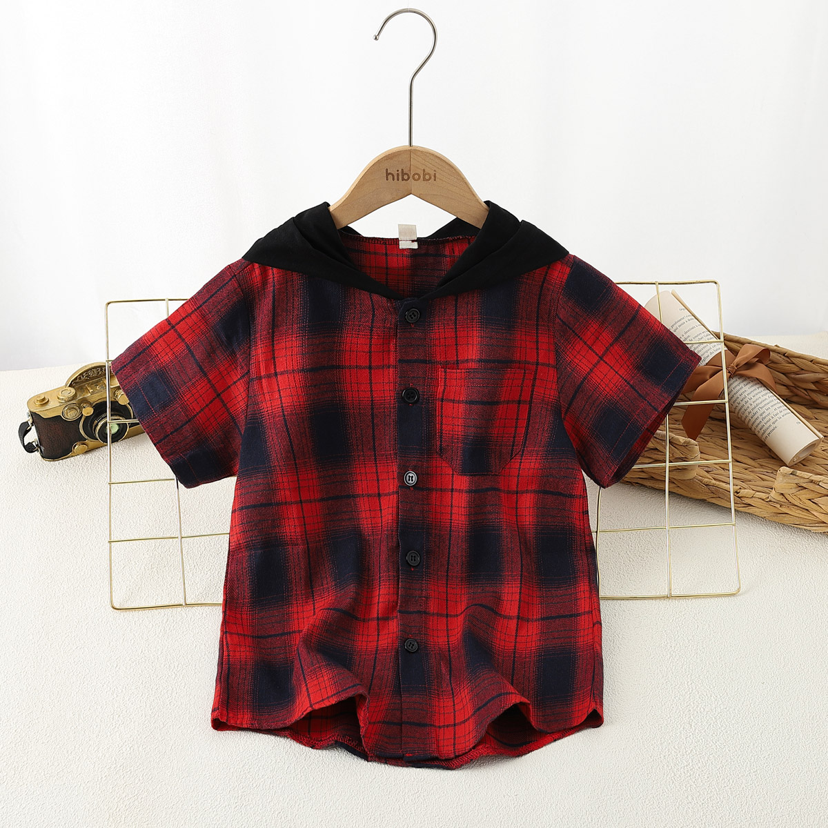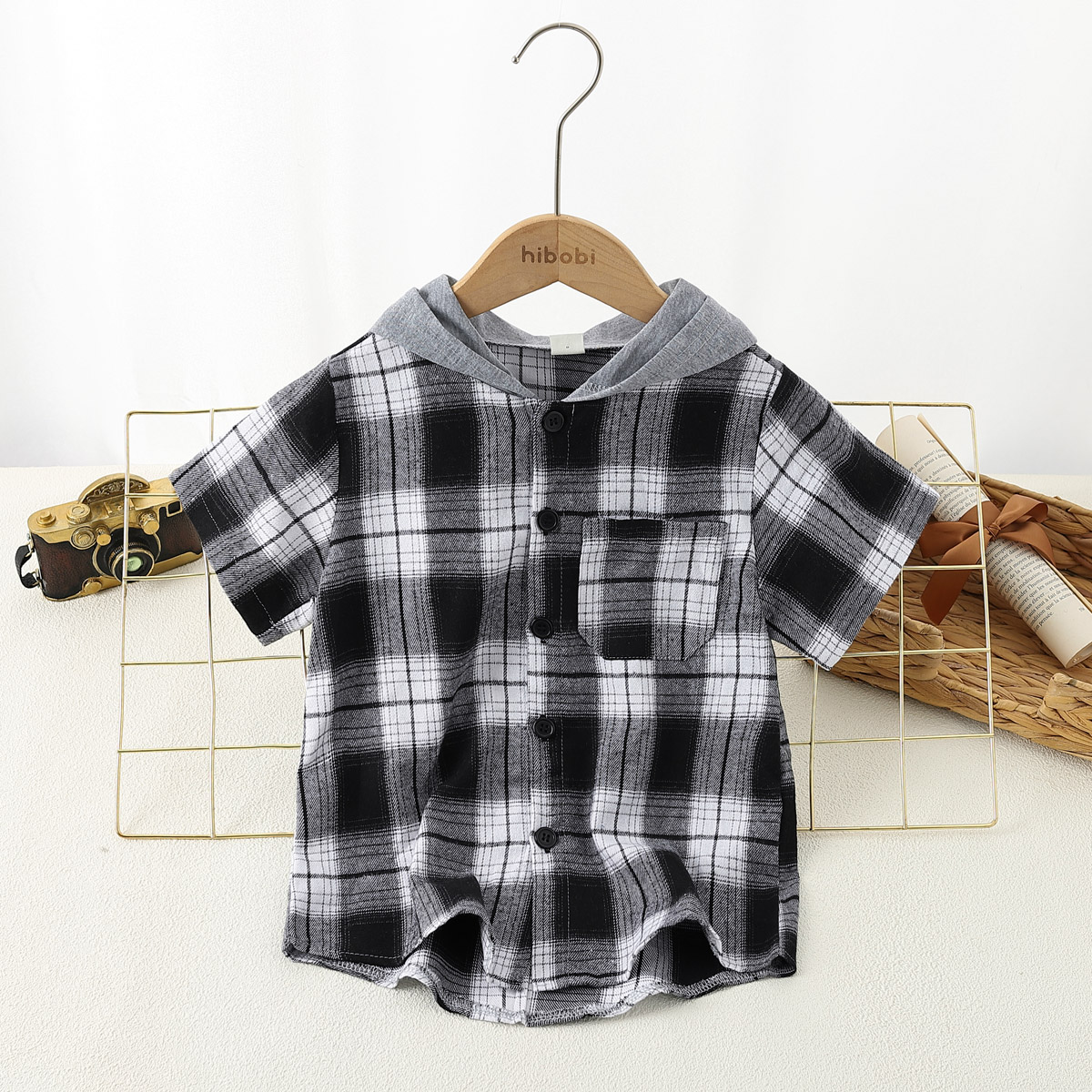 Boy Summer Short Sleeve Plaid Hooded Shirt Wholesale