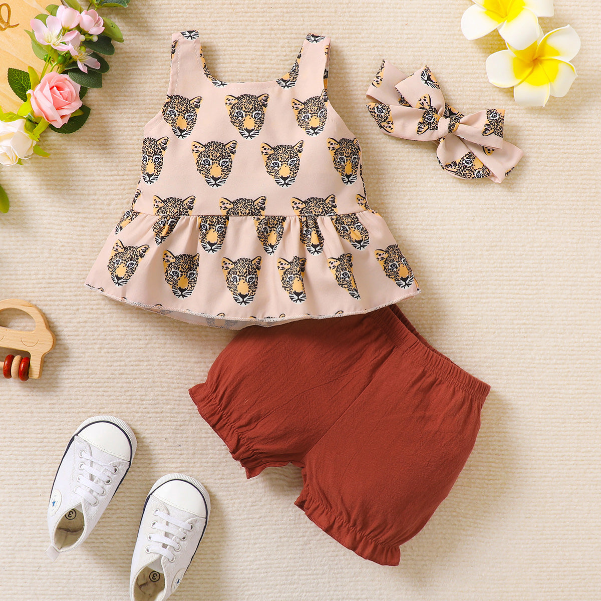 hibobi Baby Girl Cute Animal Print Vest Trousers Hairband Three Pieces Wholesale