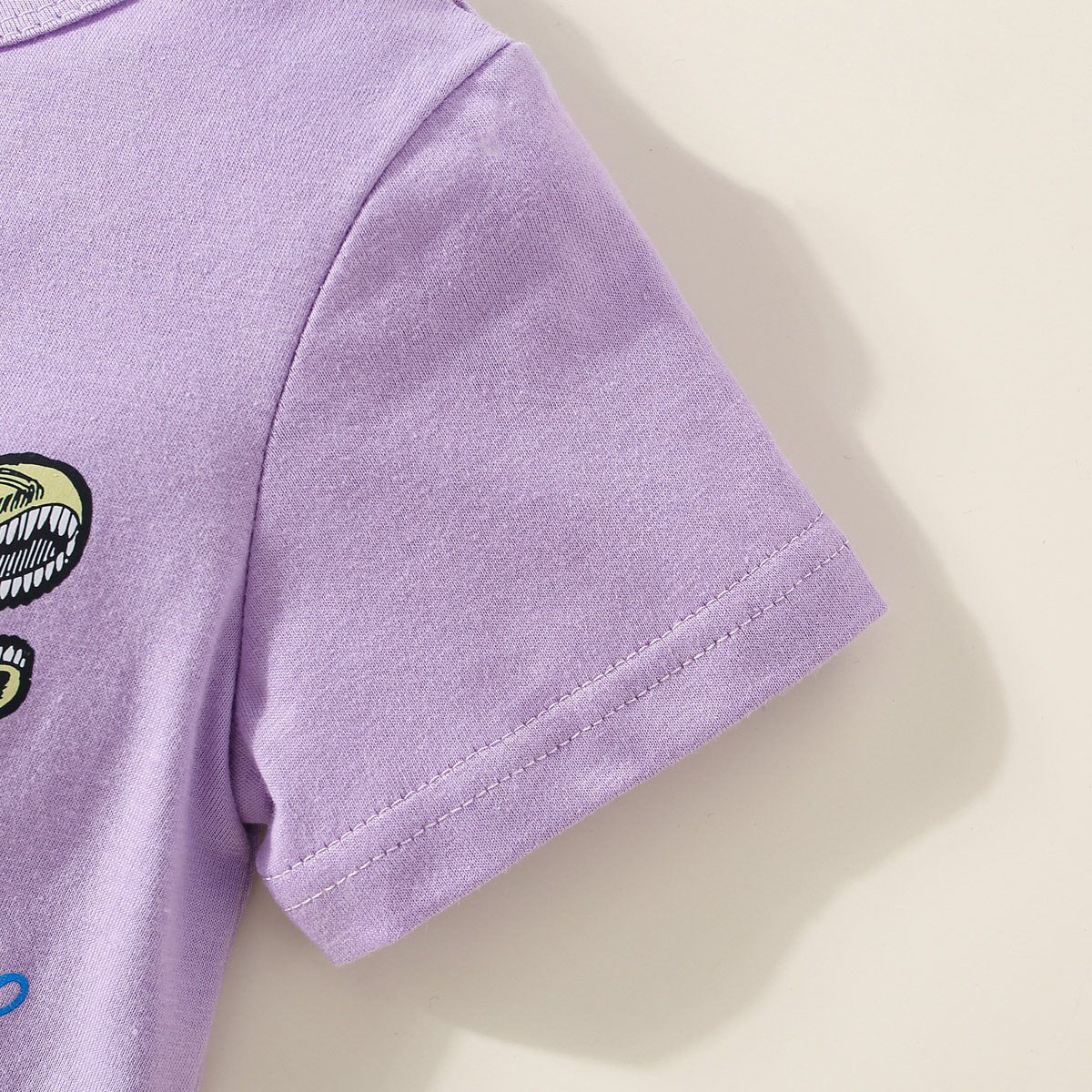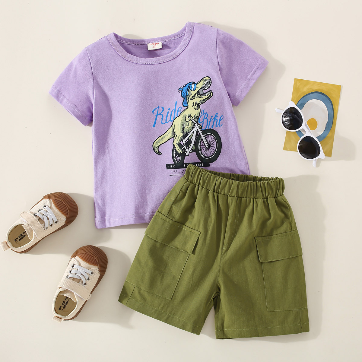 Toddler Boy Outdoor Purple Dinosaur Print T-shirt and Green Shorts Suit Wholesale