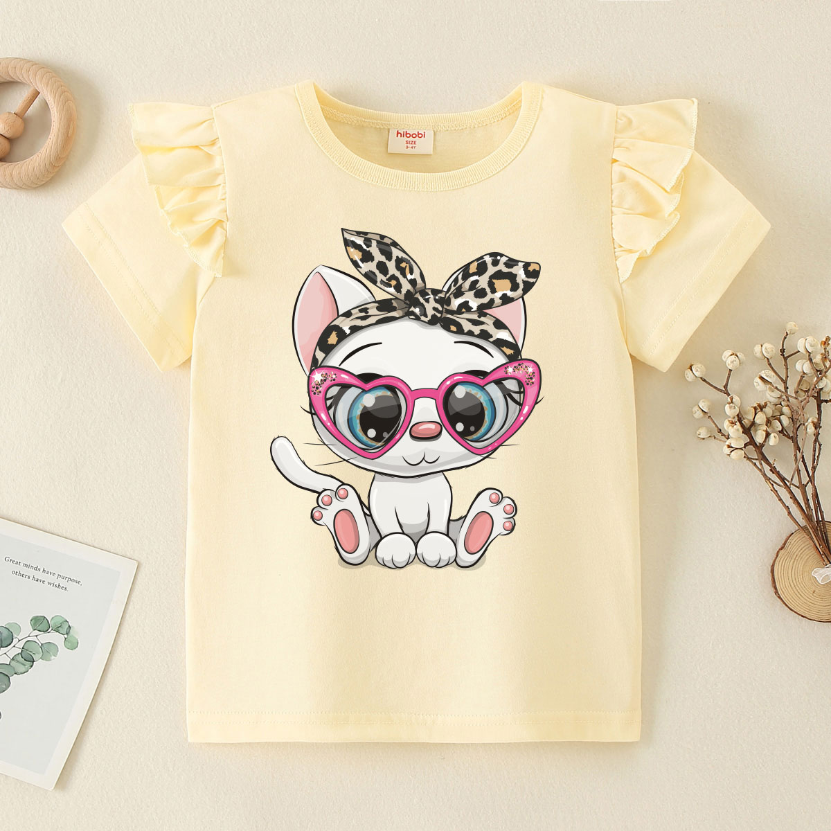 Toddler Girl Baby Heart Shaped Glasses Cat Print Fly Sleeve Short Sleeve Wholesale