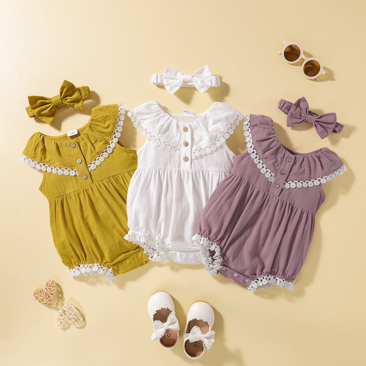 hibobi Girl Baby Solid Patchwork White Lace Bodysuits & Headbands Wholesale