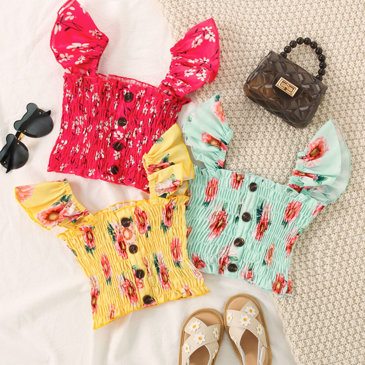 Kids Girls Floral Print Ruffle Trim Shirred Button Front Vest Wholesale