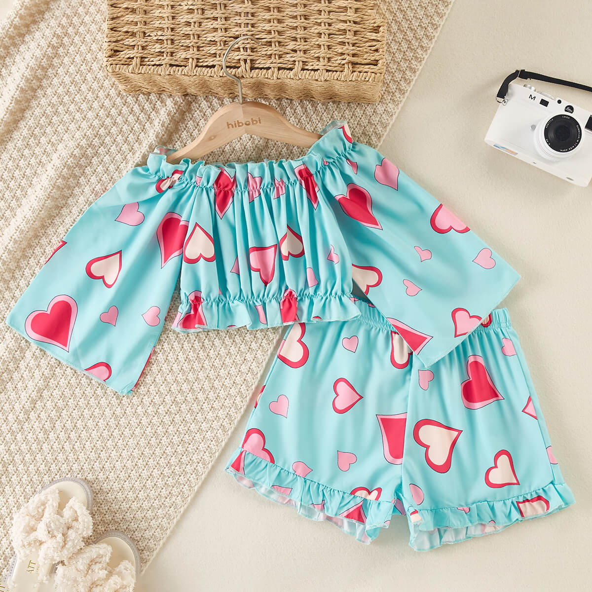 Kids Girls Heart Print Flounce Sleeve Crop Top & Ruffle Trim Shorts Set Wholesale