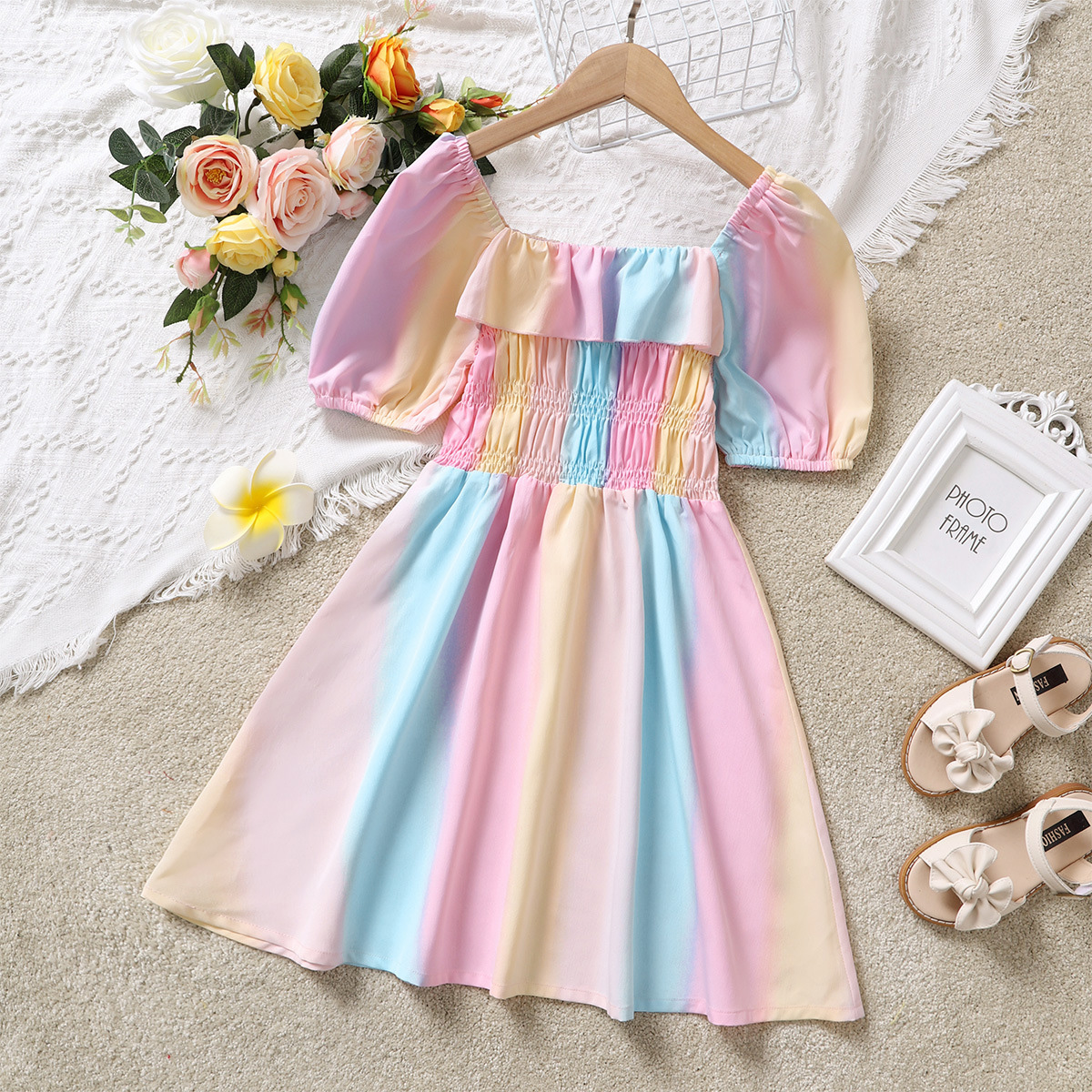 Kids Girls Summer Sweet Rainbow Puff Sleeves A-line skirt Dress Wholesale