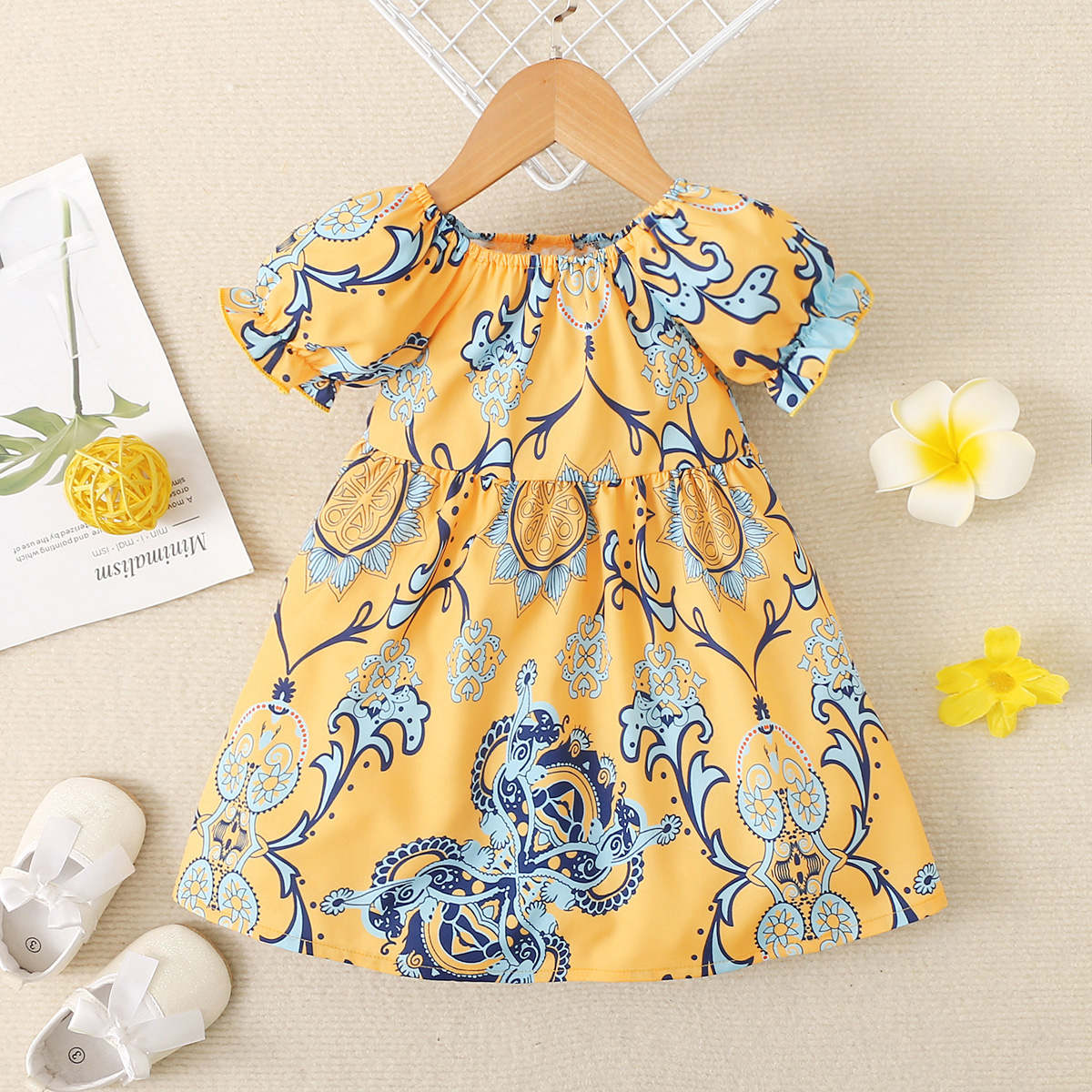 Toddler Girls Cotton Tropical Umbrella Skirt Puff Sleeve Dress Wholesale