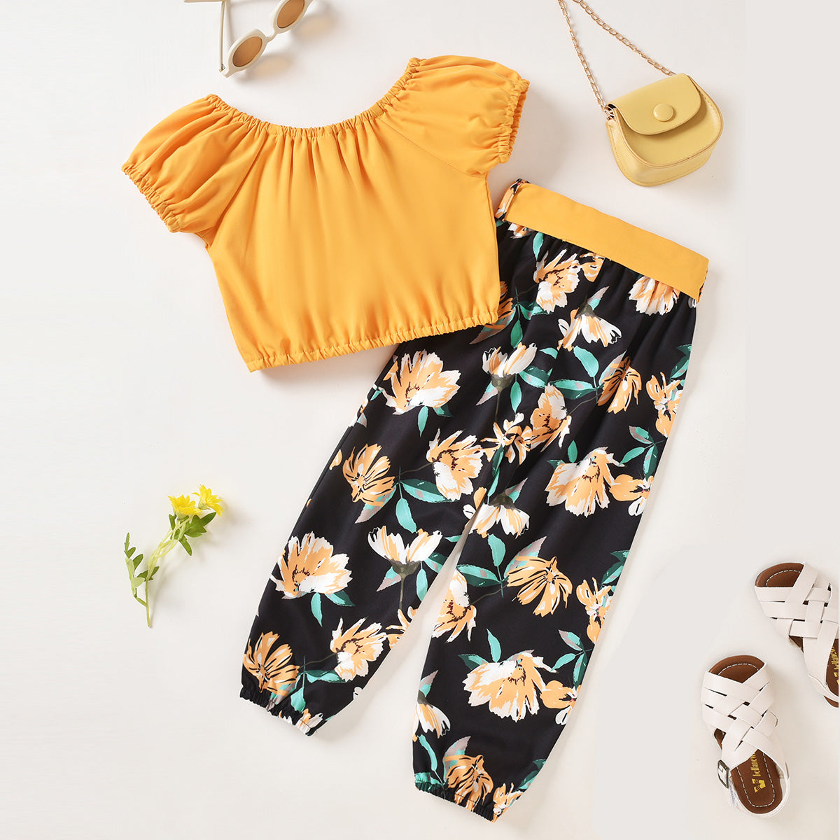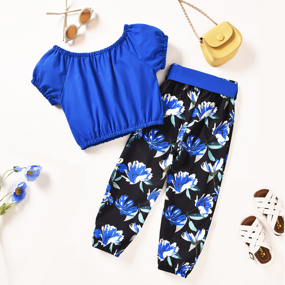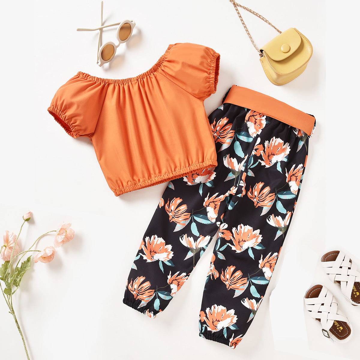 Toddler Girls Slash Neck Floral Solid Top & Pants Wholesale