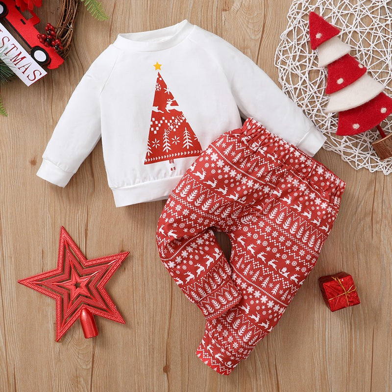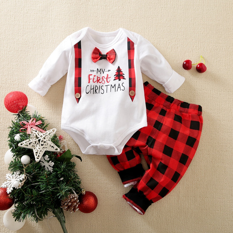 Baby Boy Christmas Print Bow Tie Plaid Long Sleeve Romper Two-piece Wholesale