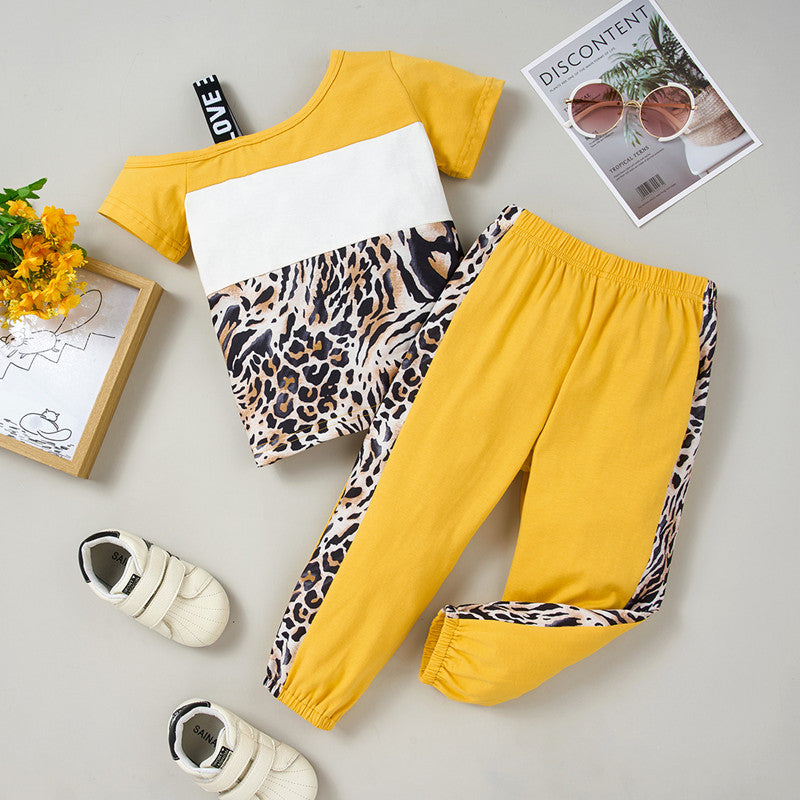 Toddler Girl Color-block Leopard One-shoulder Top & Pants Wholesale