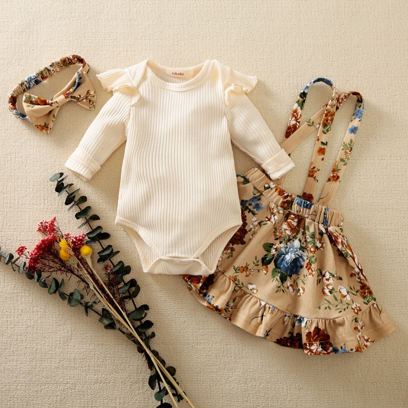 Baby Girl Ruffle Romper & Floral Suspender Skirt & Bow Headband Wholesale