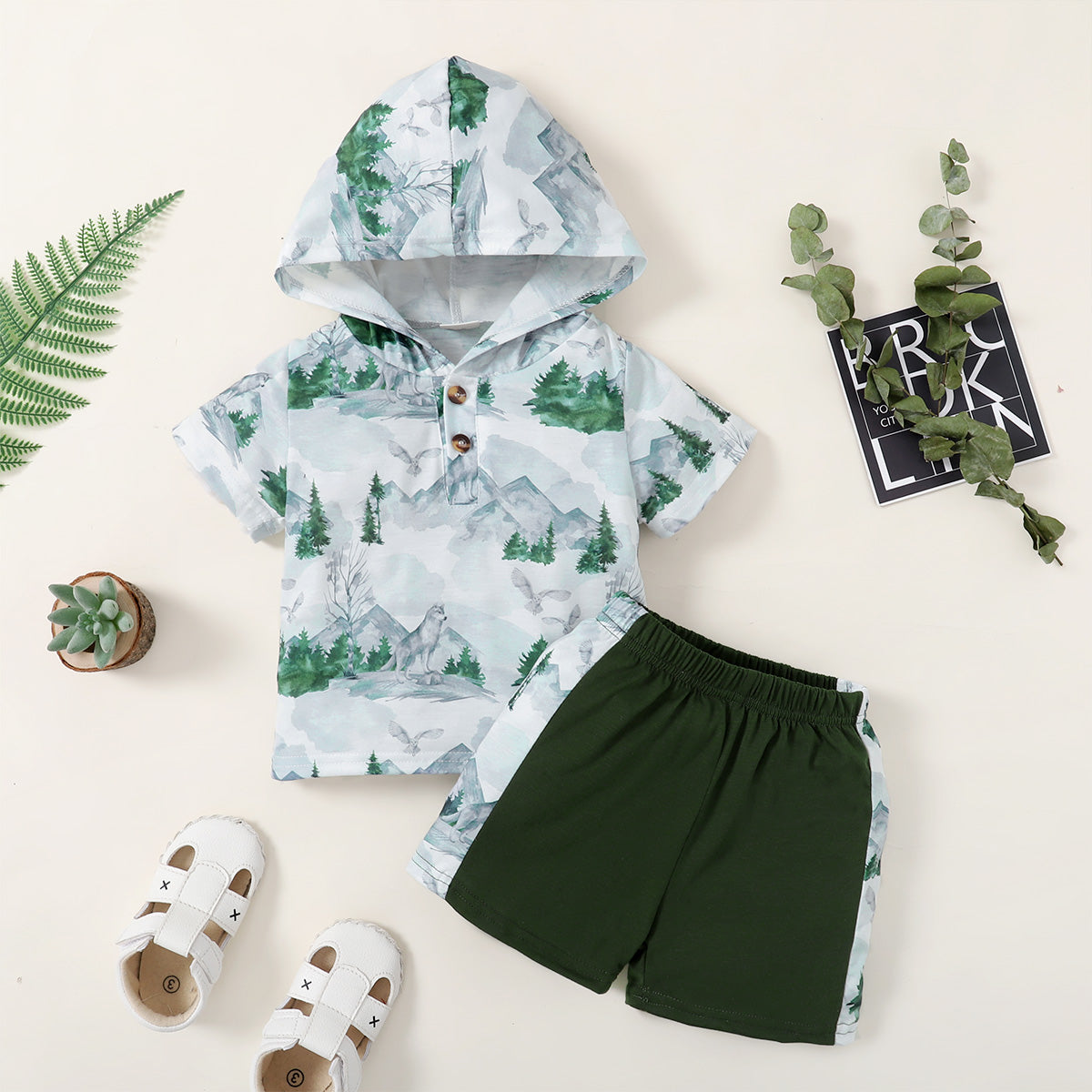 Toddler Boy Landscape Printing Casual Fabric Blocking Hoodie&Shorts Wholesale